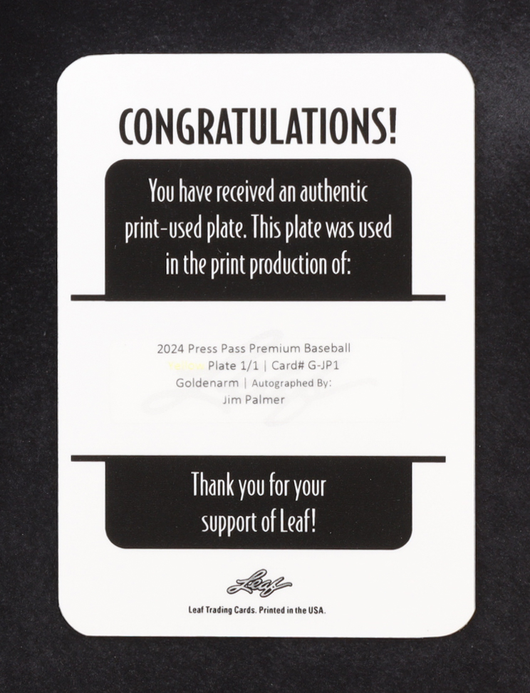 Jim Palmer 2024 Press Pass Premium Baseball Golden Arm Autographs Yellow Print Production Plate #GJP1 #1/1