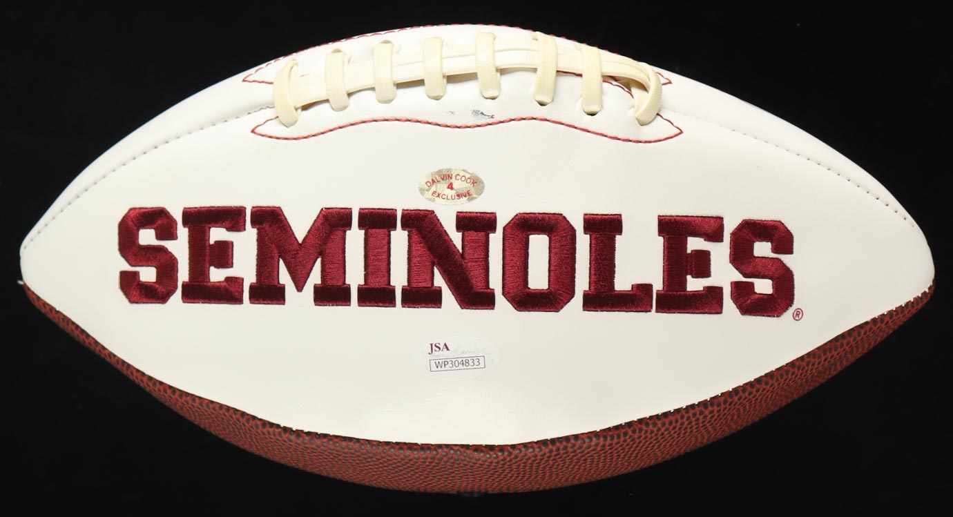 Rawlings Florida State Seminoles logo football has been hand-signed by Dalvin Cook. Please note, the ball is stained and scuffed throughout.