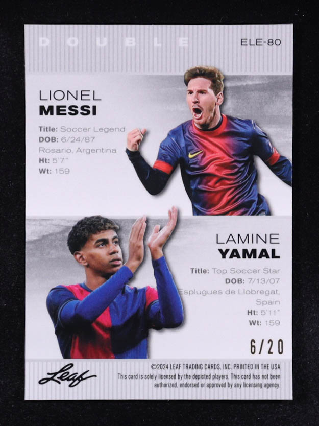 Lionel Messi / Lamine Yamal 2024 Leaf Metal Special Release Exclusive Legends Edition Dual Lazer Blue #ELE80 #6/20