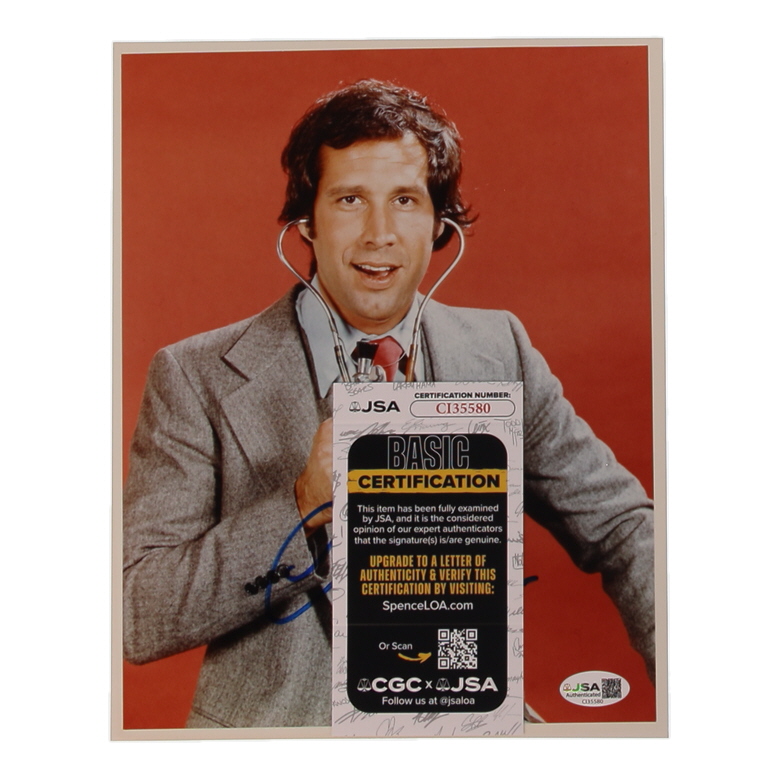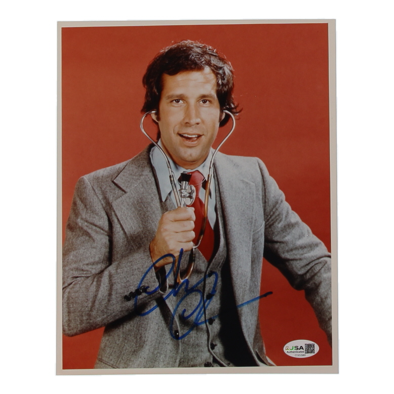 Photo measures 8” x 10” in size and has been hand-signed by Chevy Chase.