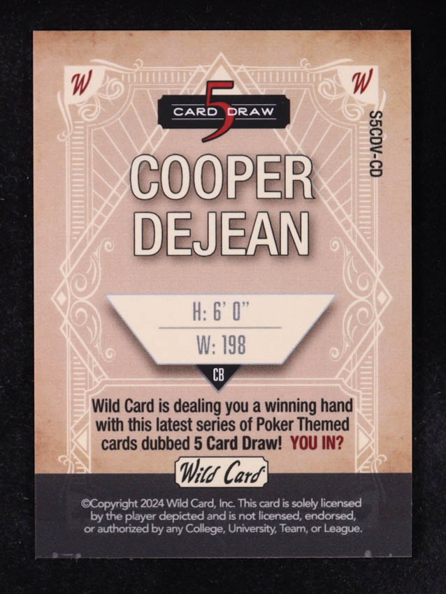 Cooper DeJean 2024 Wild Card 5 Card Draw Poker Hand Prismatic Purple #S5CDVCD RC #1/2