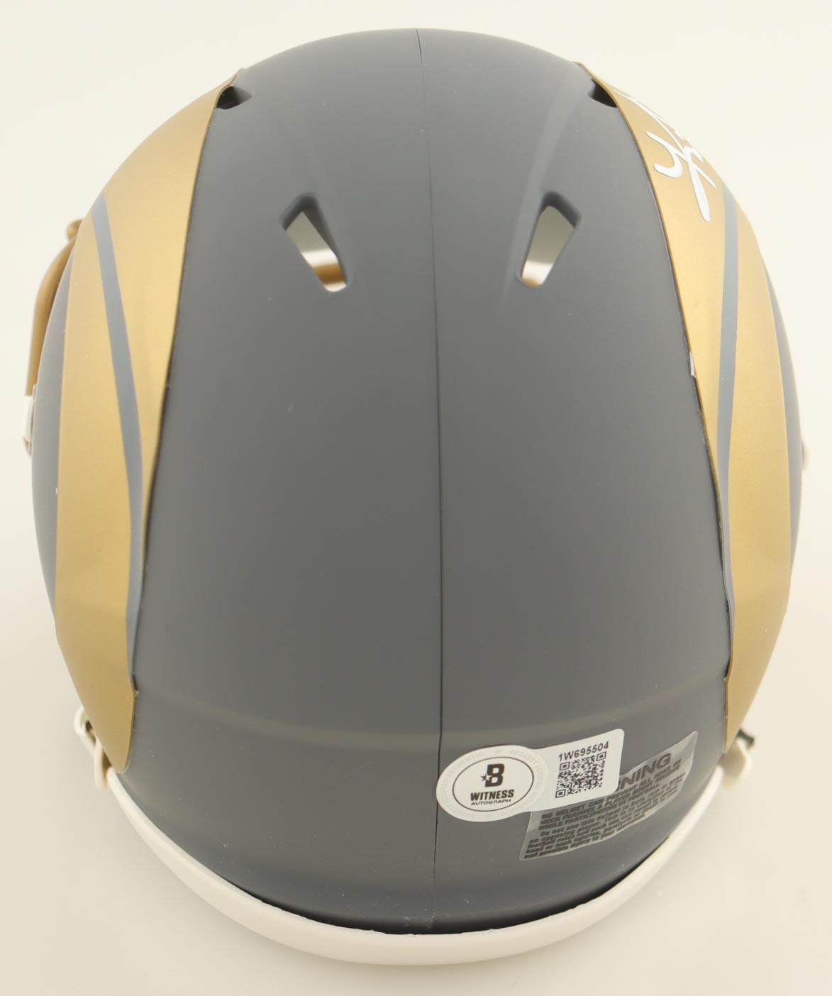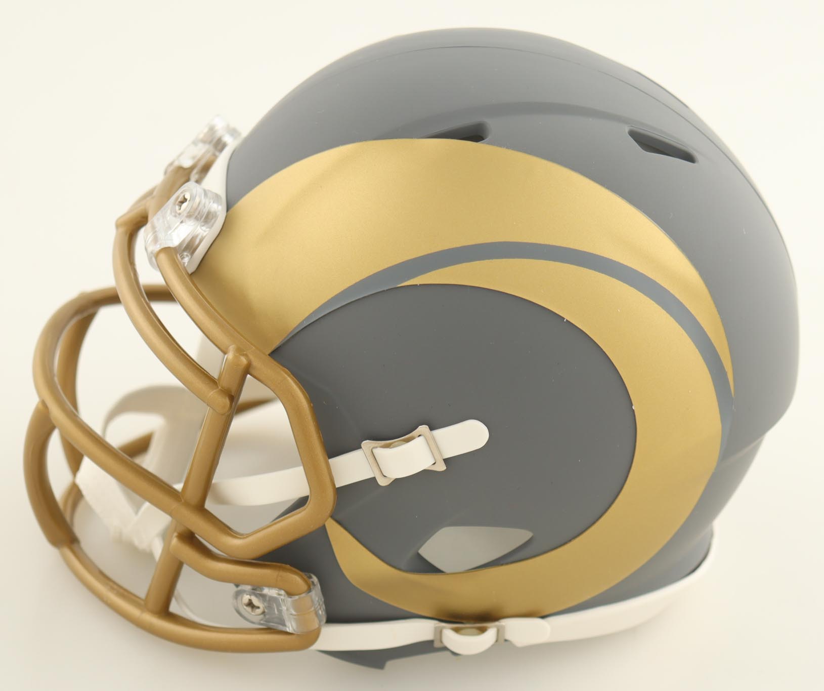 Riddell Los Angeles Rams Slate Alternate Speed mini helmet. Hand-signed by Kurt Warner.
