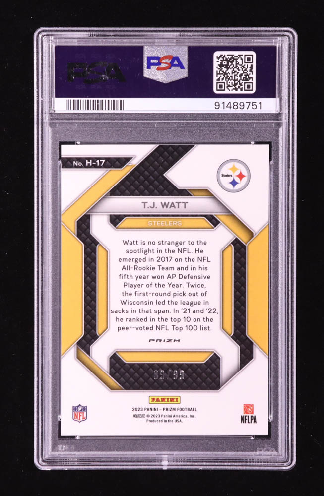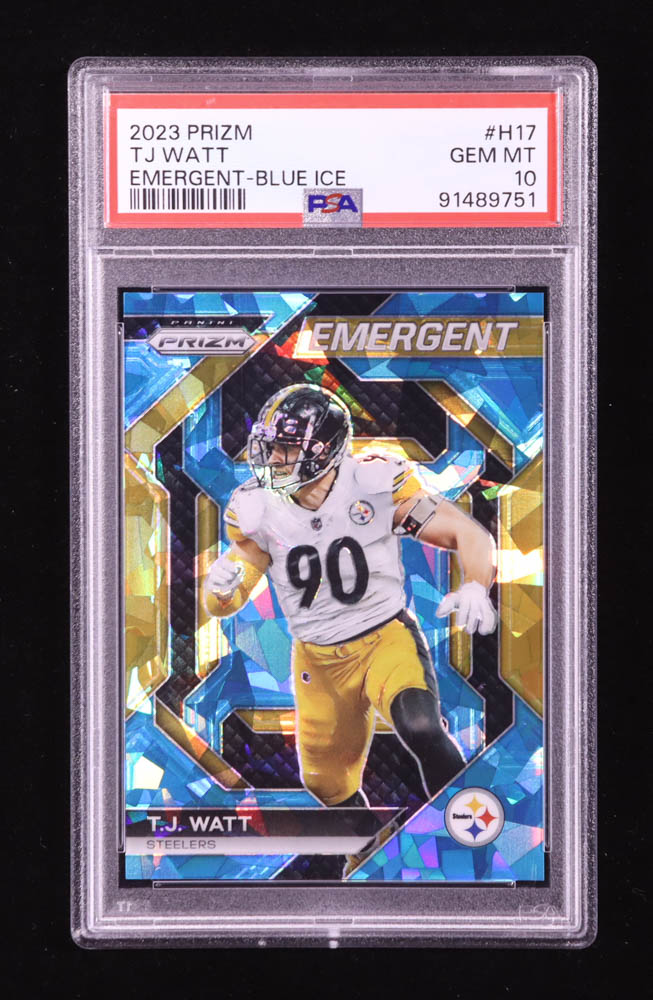 T.J. Watt 2023 Panini Prizm Emergent Prizms Blue Ice #17 #09/99 (PSA 10)