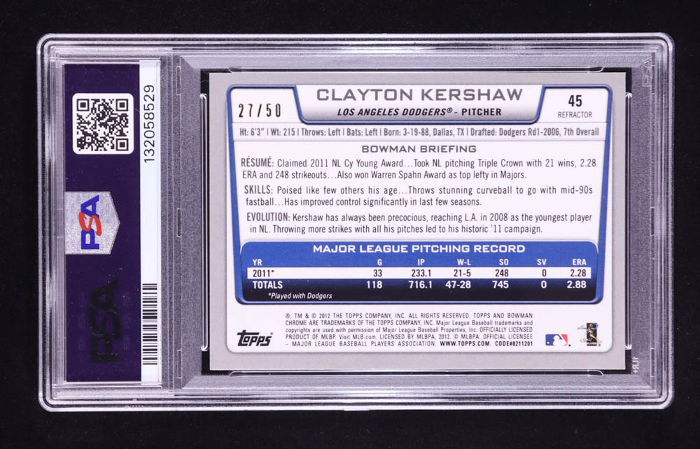 Clayton Kershaw Signed 2012 Bowman Chrome Gold Refractor #45 #27/50 (PSA 9 | Auto 10)