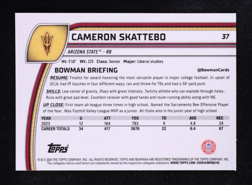 Cam Skattebo 2024 Bowman U Chrome Sapphire #37 RC