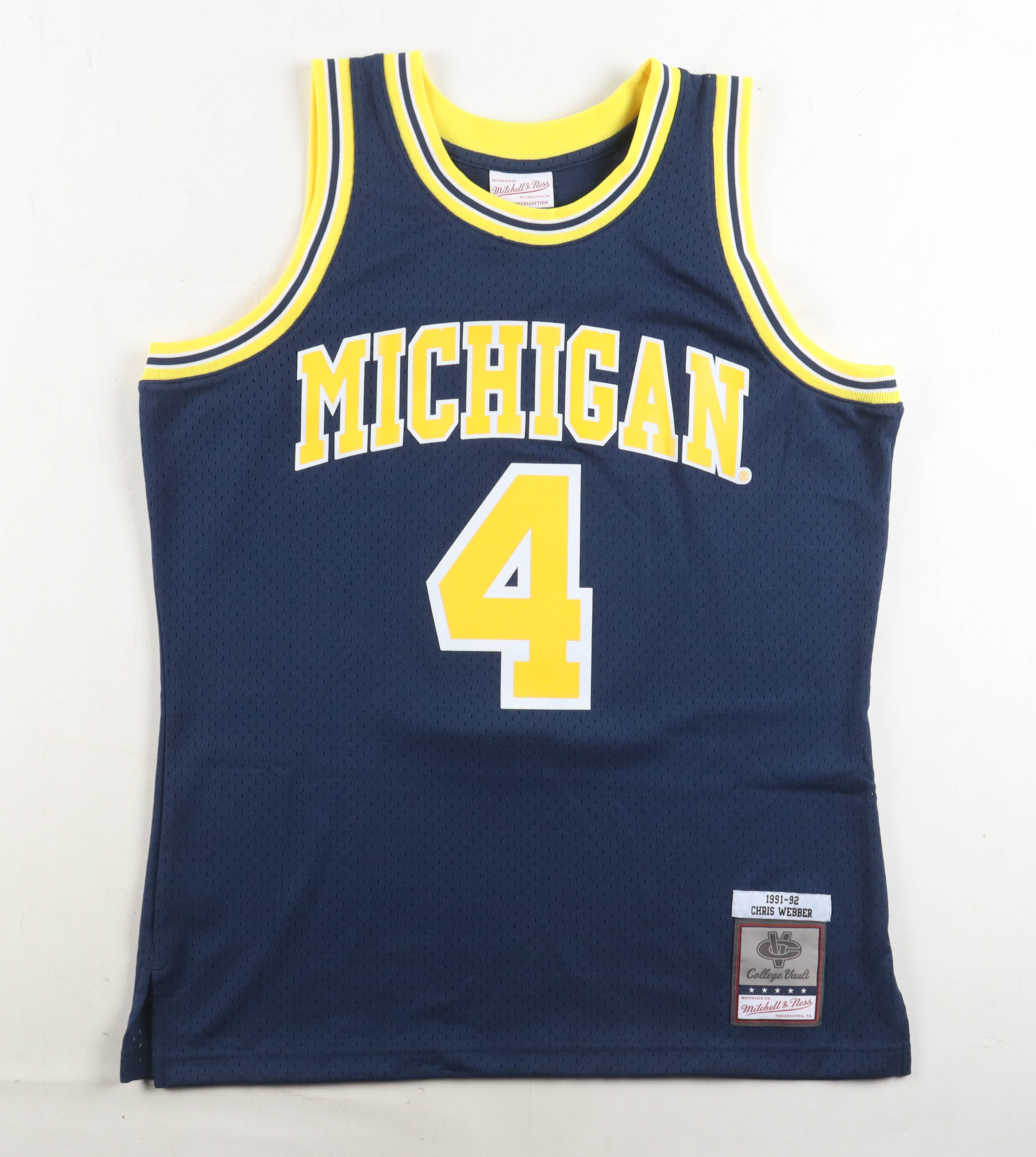 Mitchell & Ness jersey with everything pressed on, size L. Hand-signed by Chris Webber (Michigan Wolverines, HOF).
