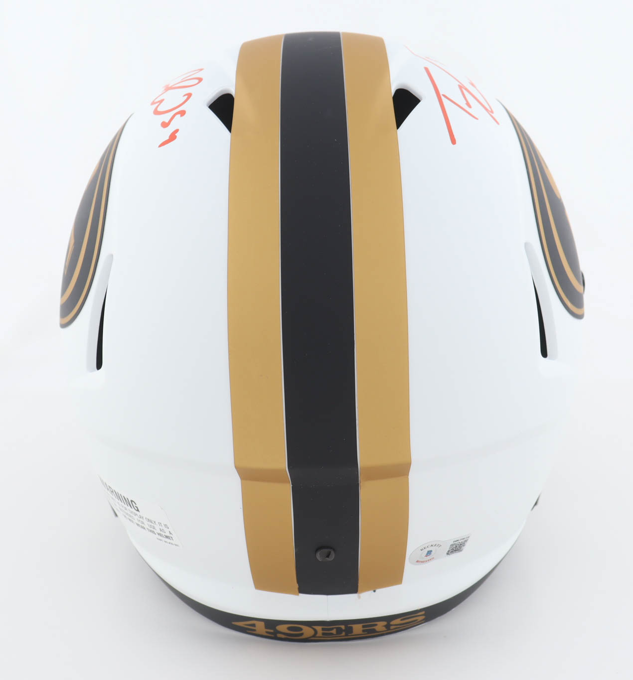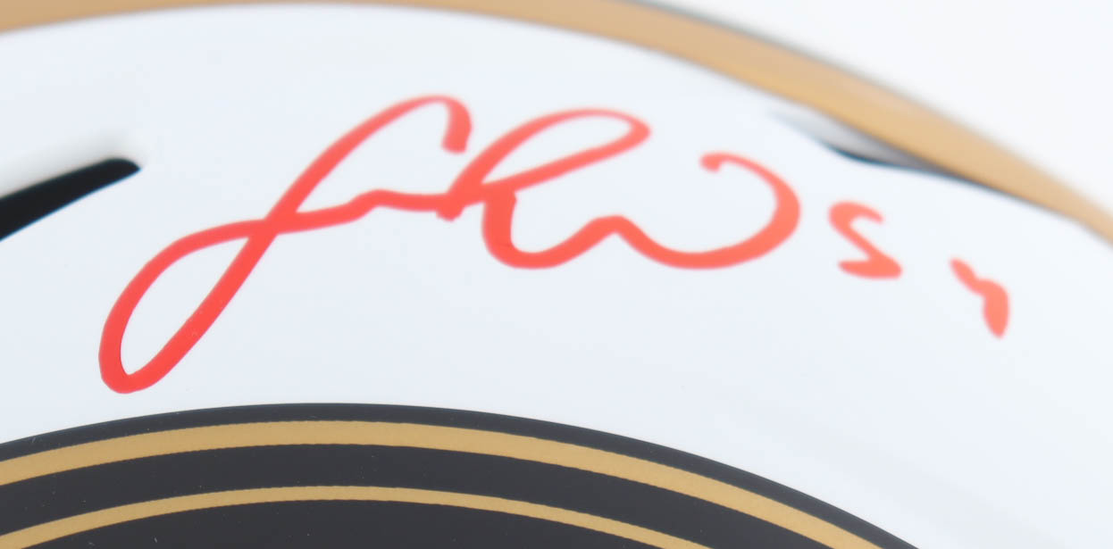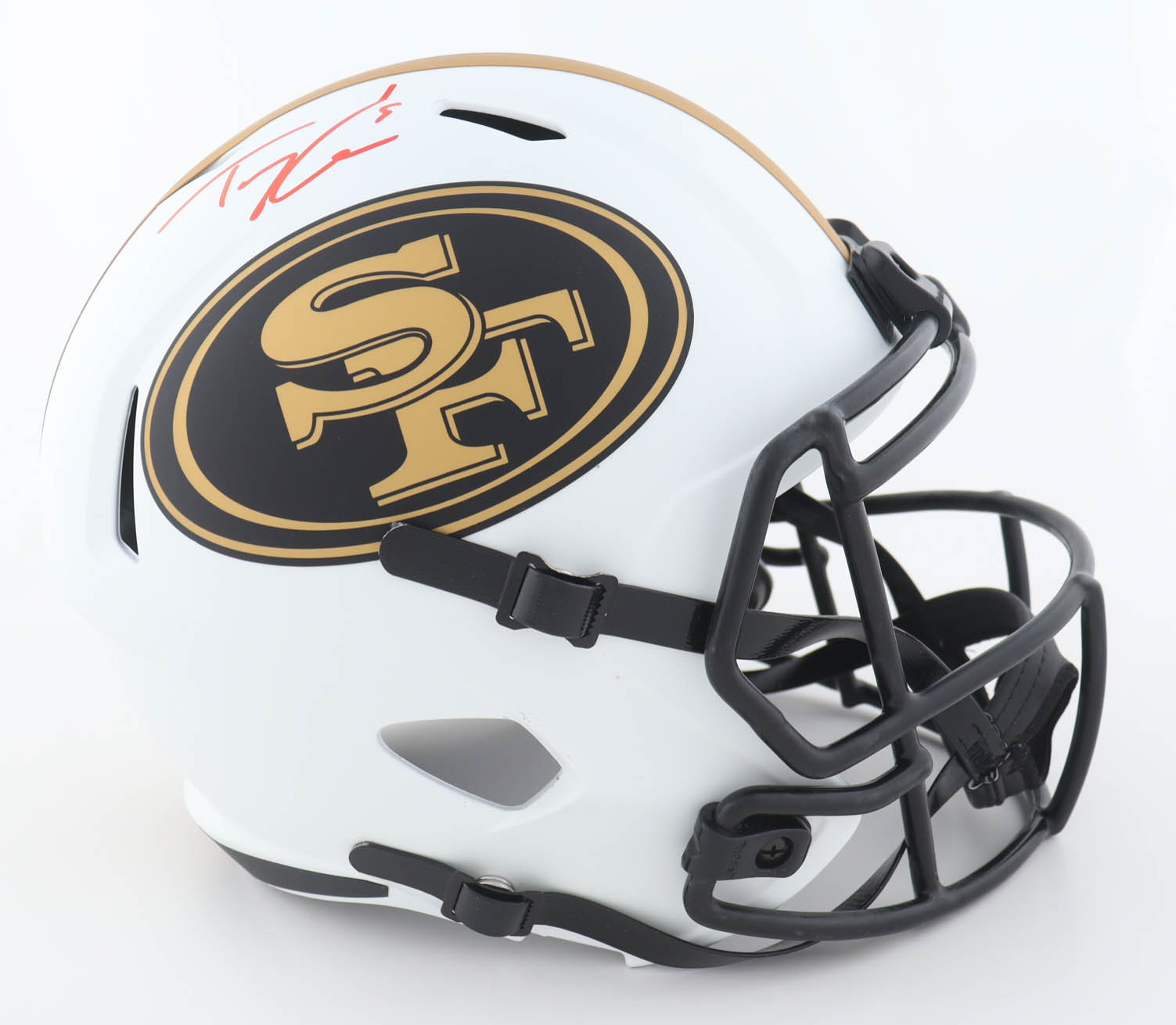 Riddell San Francisco 49ers full-size replica lunar eclipse alternate speed helmet. Has been hand-signed by Fred Warner and Trey Lance.