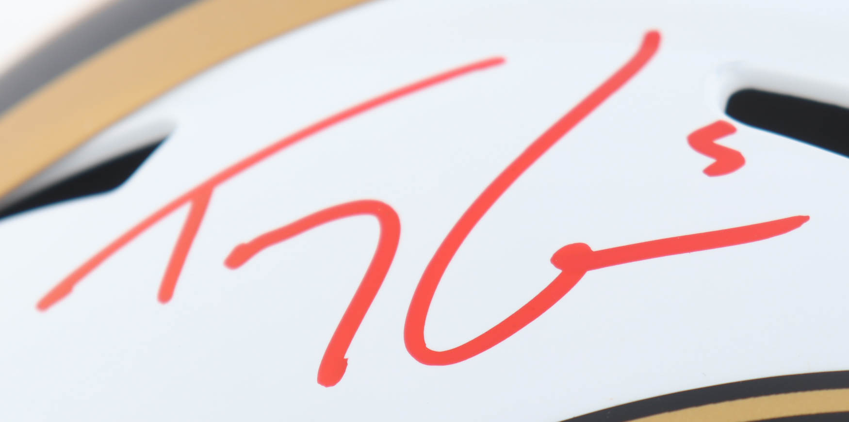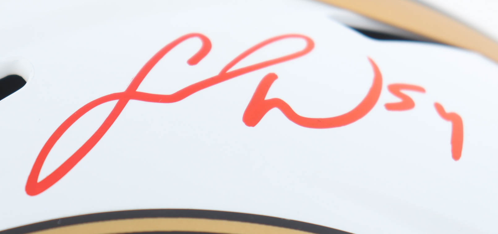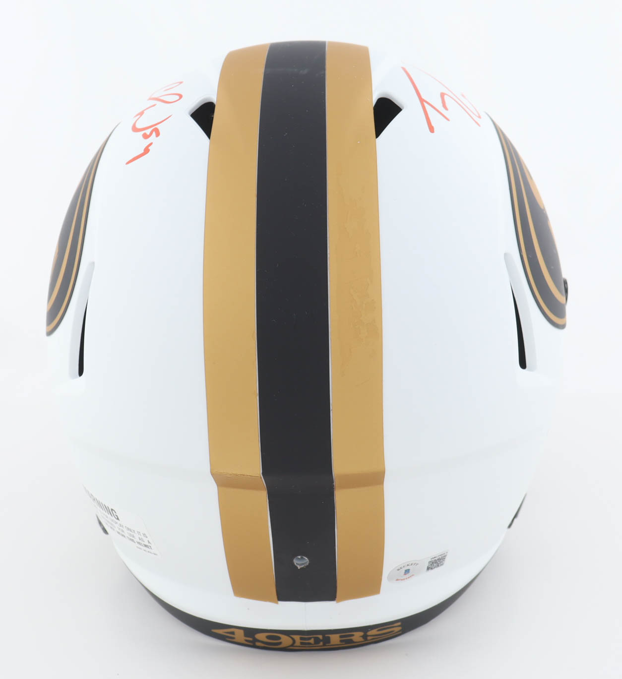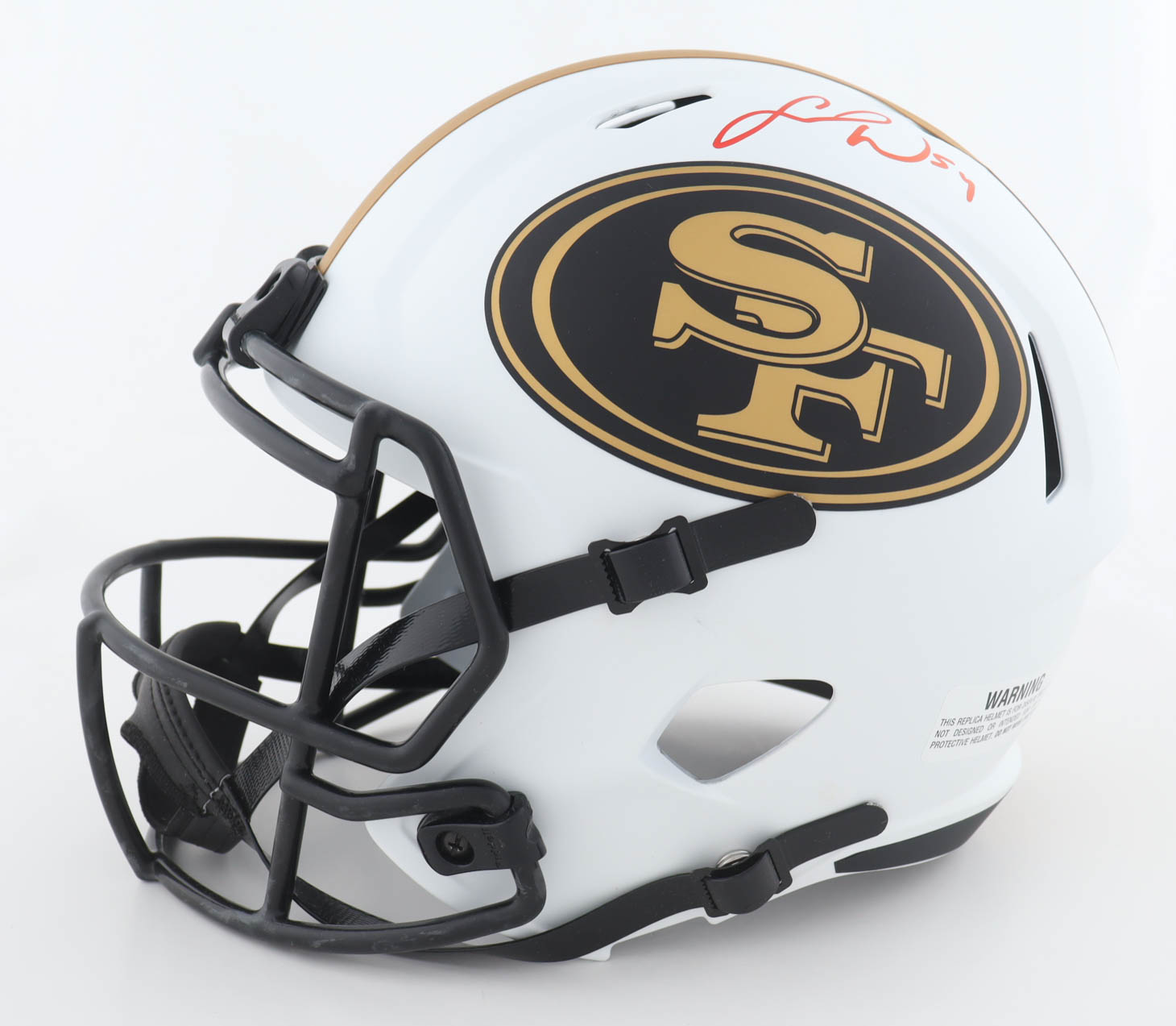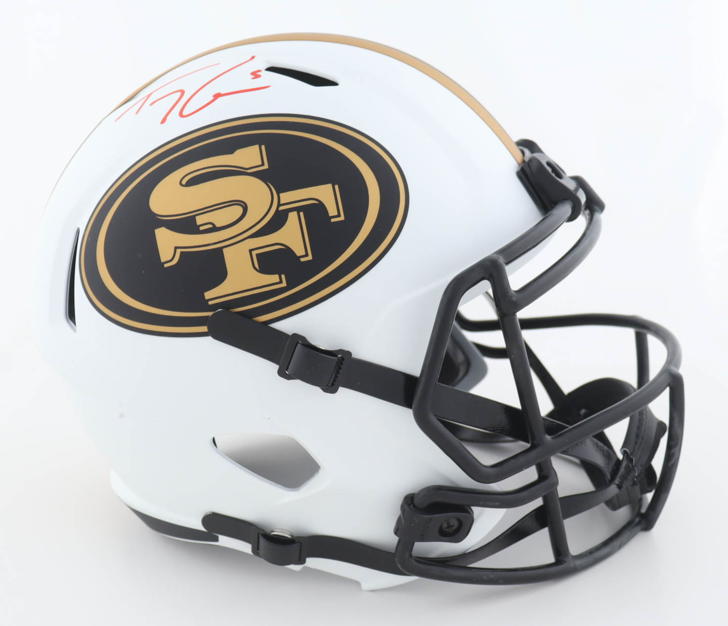 Riddell San Francisco 49ers full-size replica lunar eclipse alternate speed helmet. Has been hand-signed by Fred Warner and Trey Lance.