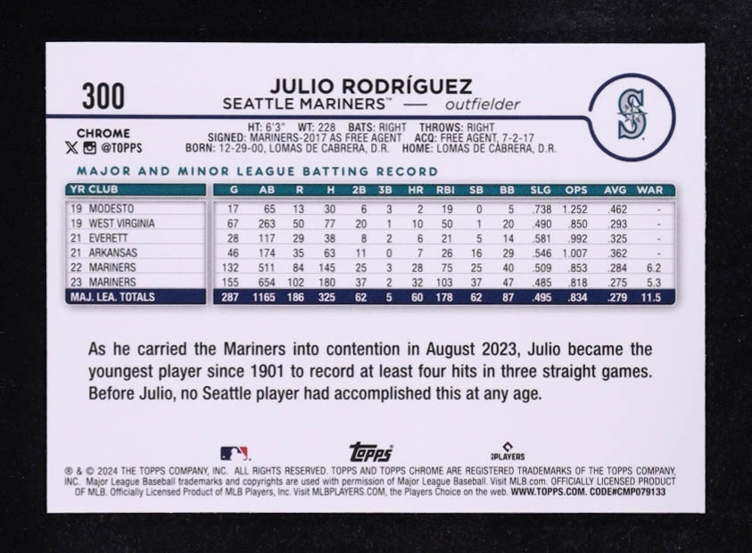 Julio Rodriguez 2024 Topps Chrome Green Refactor #300 #15/99