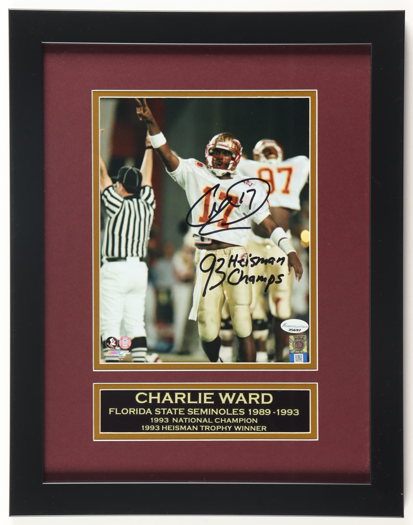 Charlie Ward Signed Florida State Seminoles Custom Framed Photo Display Inscribed "93 Heisman 93 Champs" (SportsCollectibles)