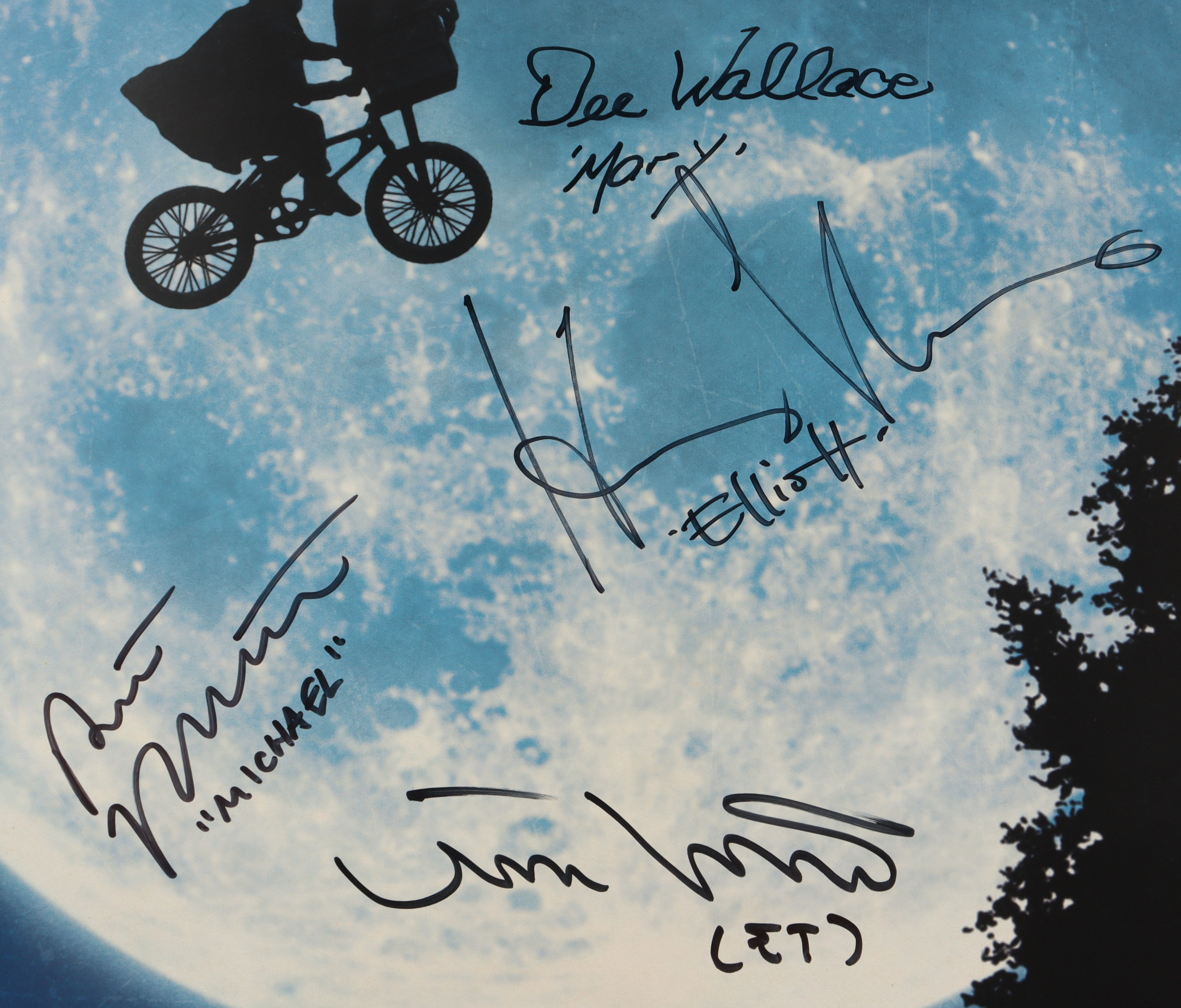 Poster measures 23" x 36" in size and has been hand-signed and inscribed by Matthew De Meritt, Dee Wallace and Robert MacNaughton. Please note that there is a slight tear and hole on the top right of the photo.
