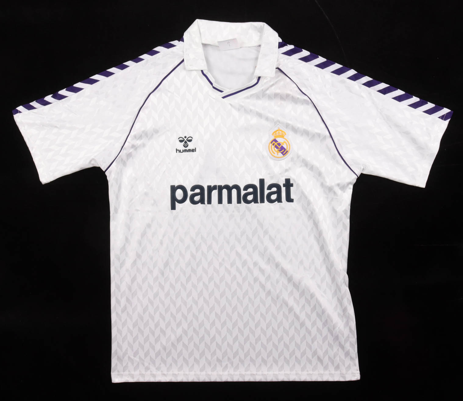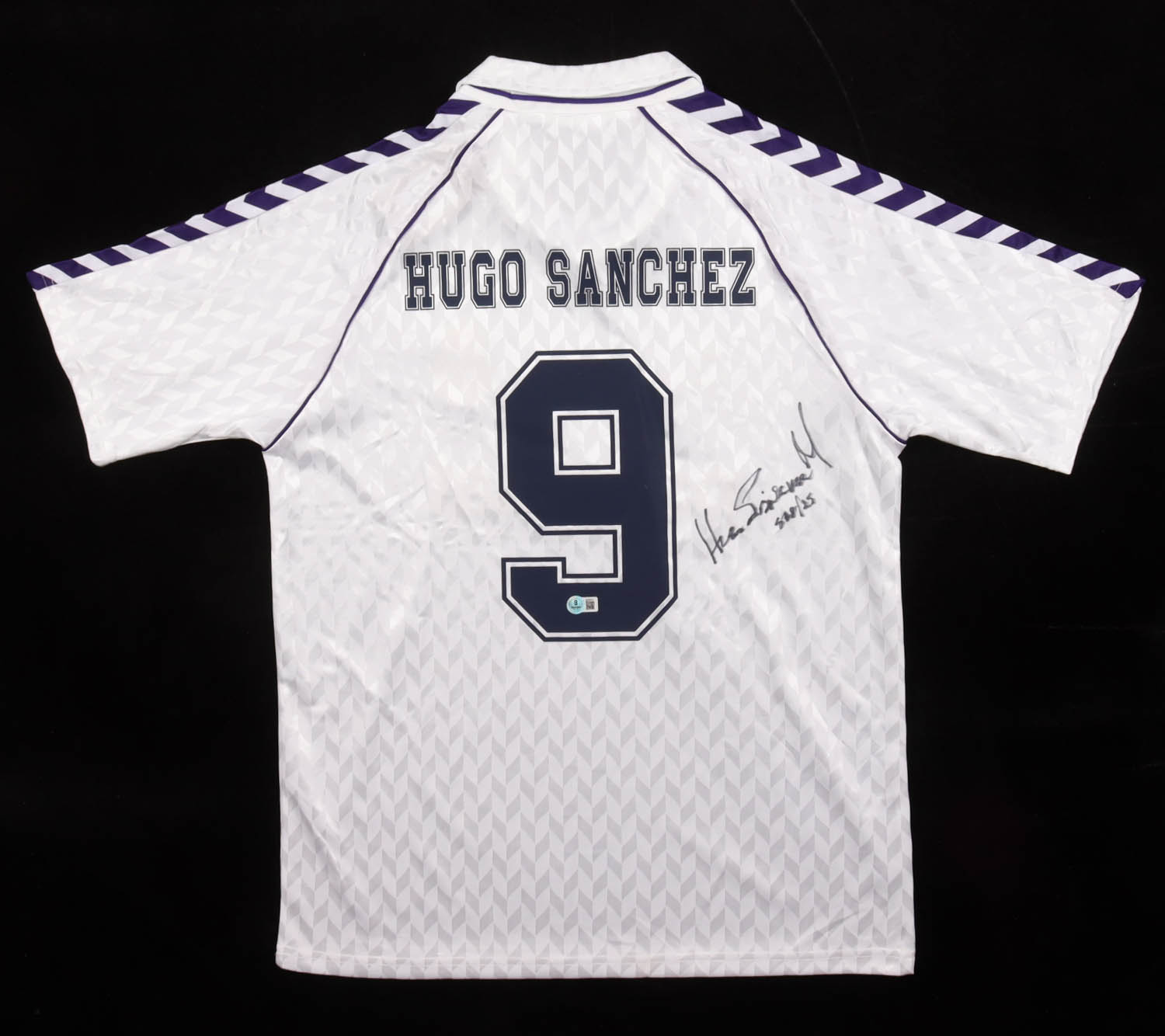 Hummel authentic jersey with everything pressed on, size XL. Hand-signed and inscribed by Hugo Sanchez (Real Madrid FC).
