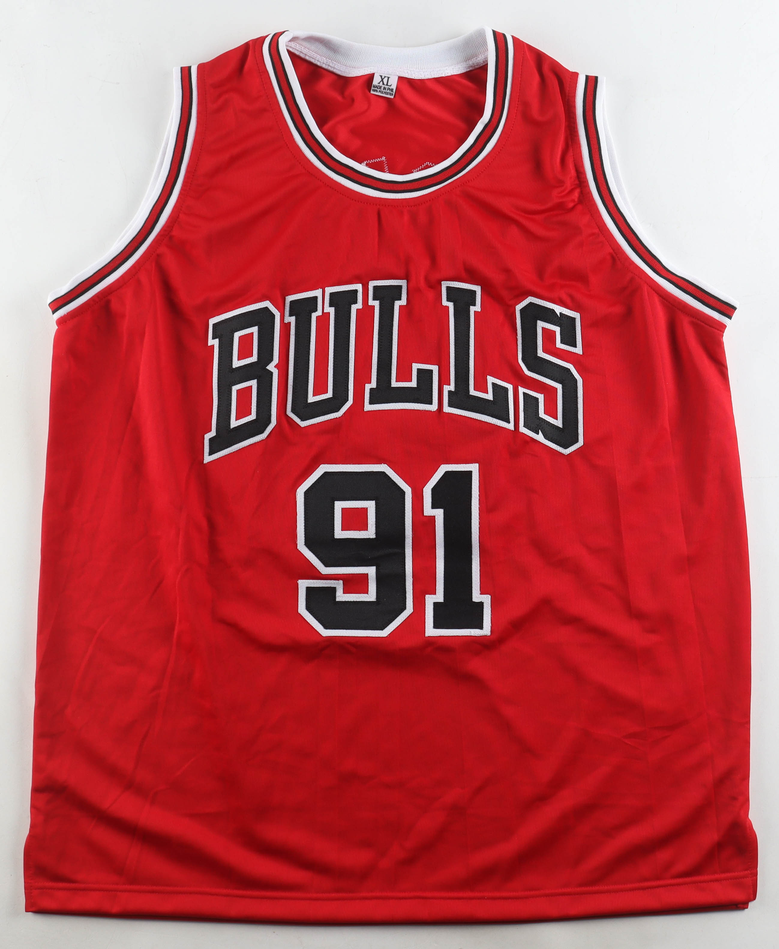 Custom jersey with everything sewn on, size XL. Hand-signed by Dennis Rodman (Chicago Bulls, HOF).