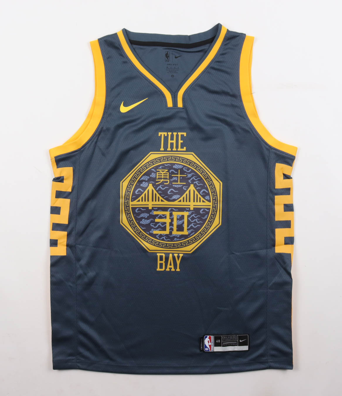 Nike authentic jersey with everything sewn on, size 48. Hand-signed by Stephen Curry (Golden State Warriors).