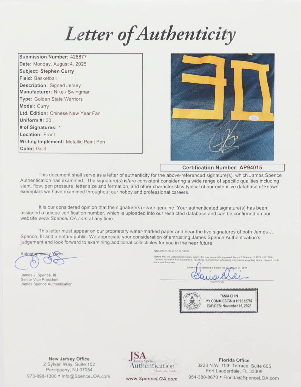 Stephen Curry Signed Warriors Nike Authentic Jersey (JSA)