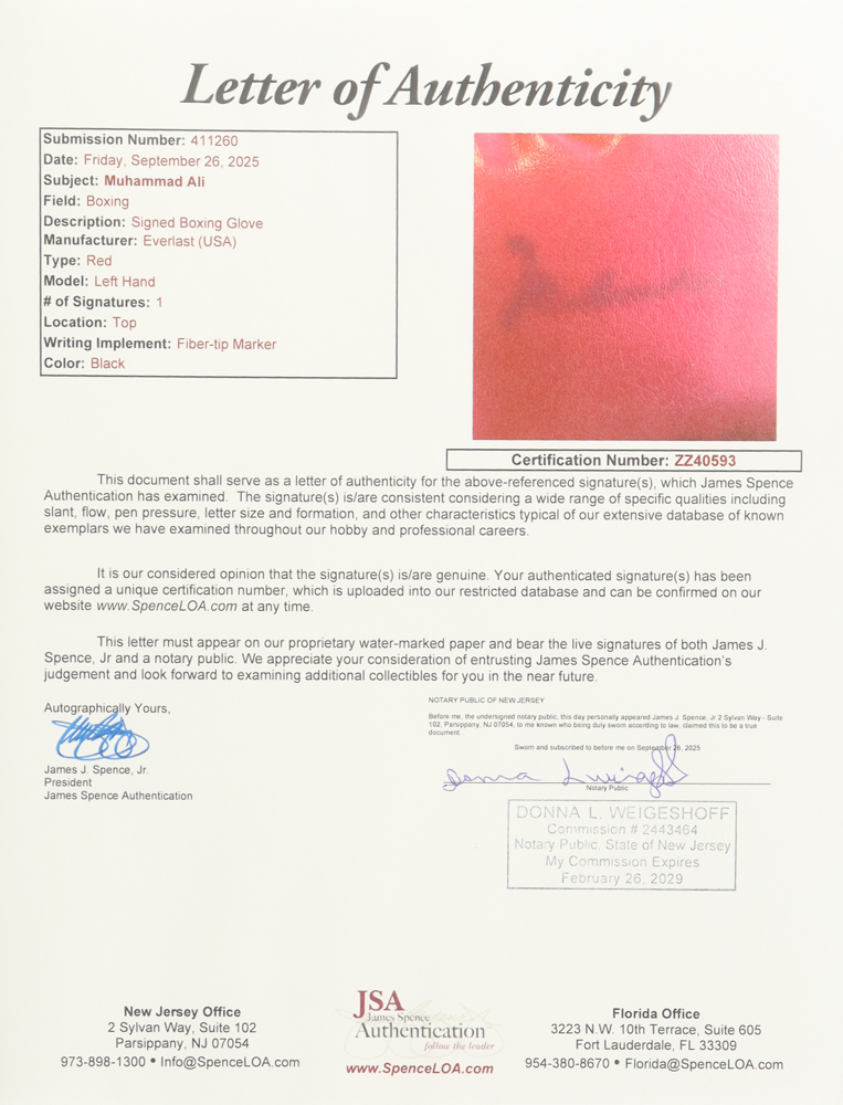 Everlast boxing glove. The glove has been hand-signed by Muhammad Ali (D. 2016, HOF). Please note that the signature is slightly faded.