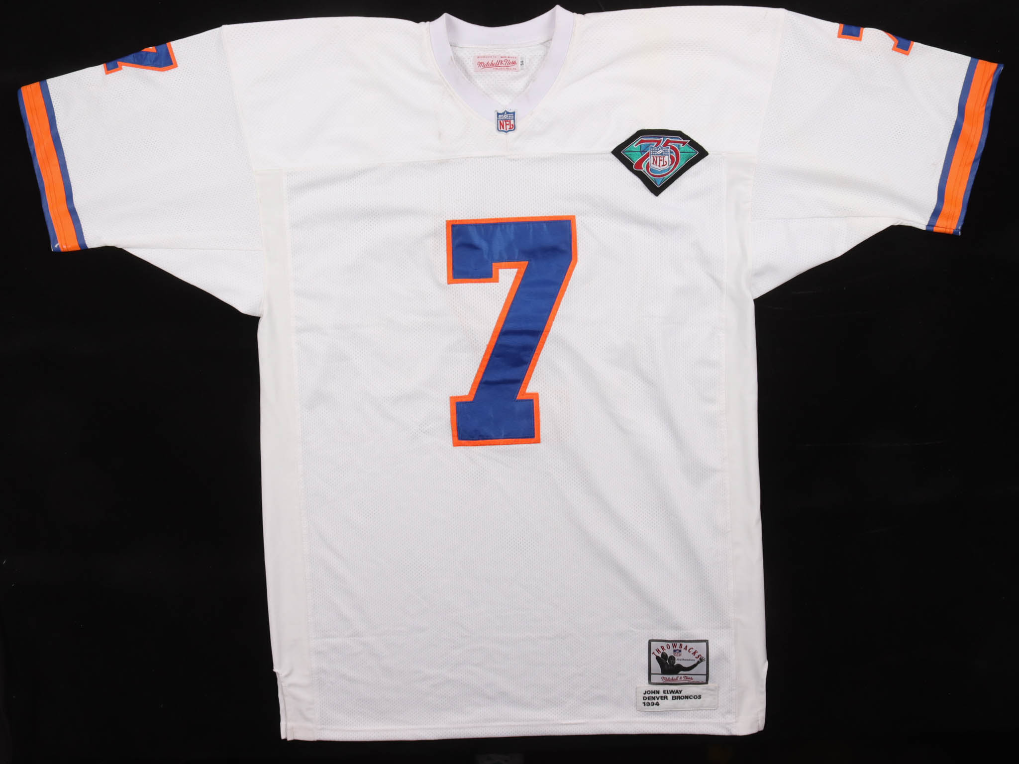 Mitchell & Ness jersey everything sewn on, size 54. Includes 75th Anniversary patch. Please note, the jersey is unsigned and is stained on the collar. Please see photos for more details. (Denver Broncos).