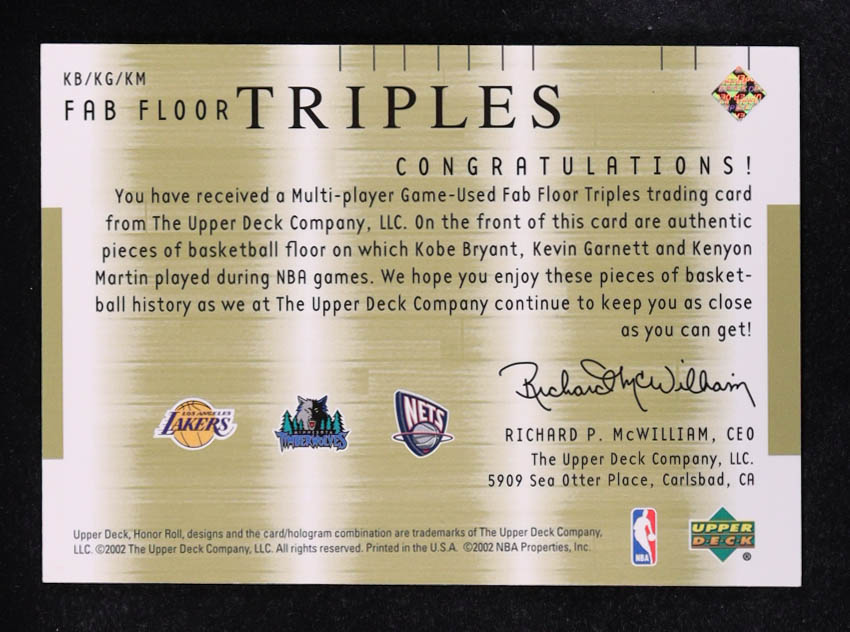 Kobe Bryant / Kevin Garnett / Kenyon Martin 2001-02 Upper Deck Honor Roll Fab Floor Triples #2