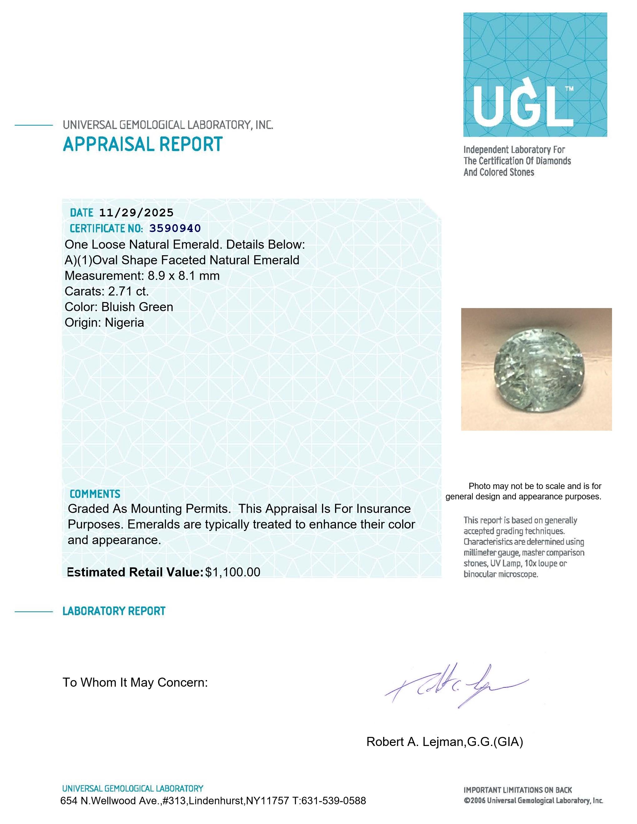 2.71 Carats Loose Natural Emerald | Estimated Retail Value: $1,100 (UGL Cert)