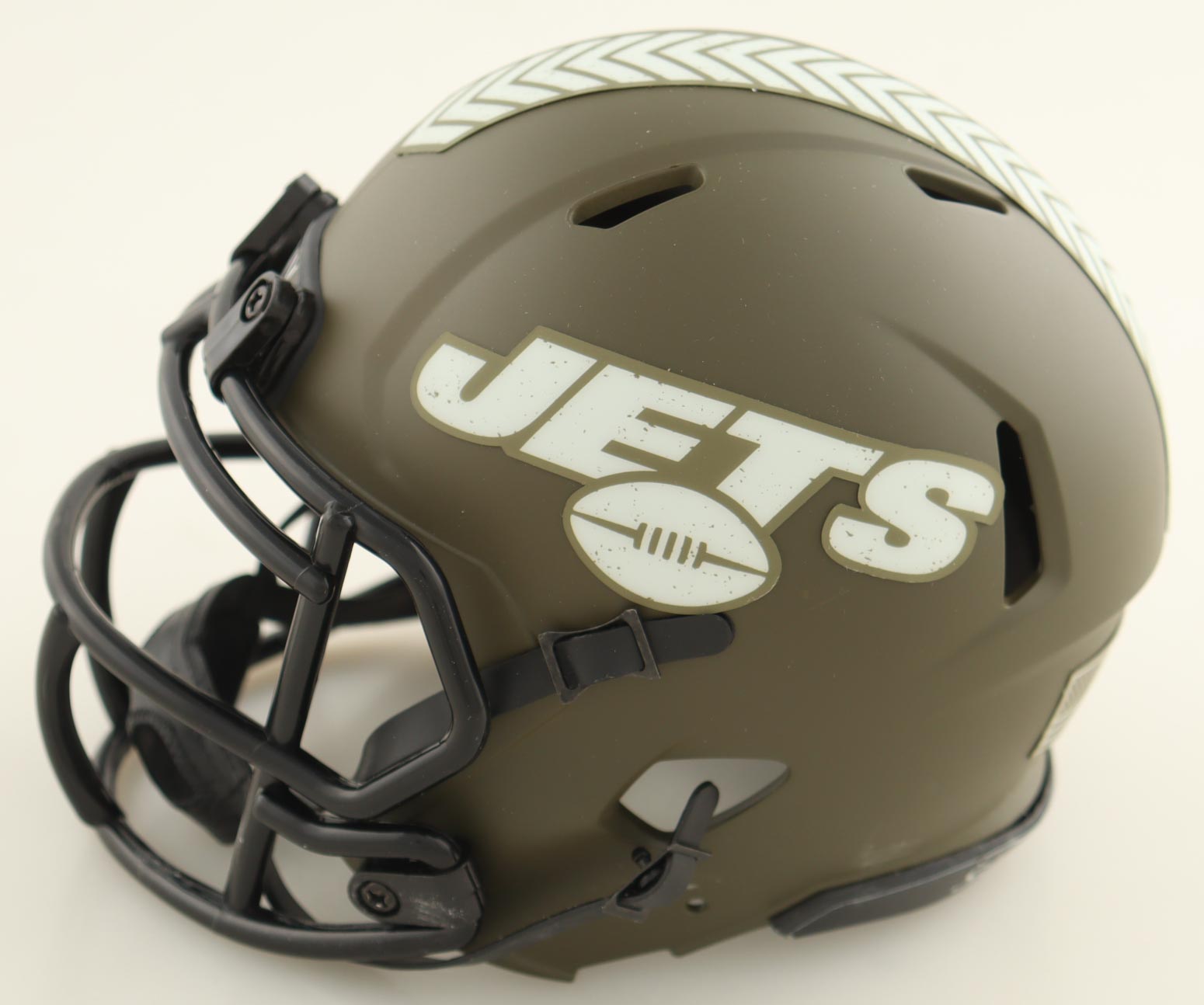 Riddell New York Jets Salute To Service Alternate Speed mini helmet. Hand-signed by Malachi Corley.