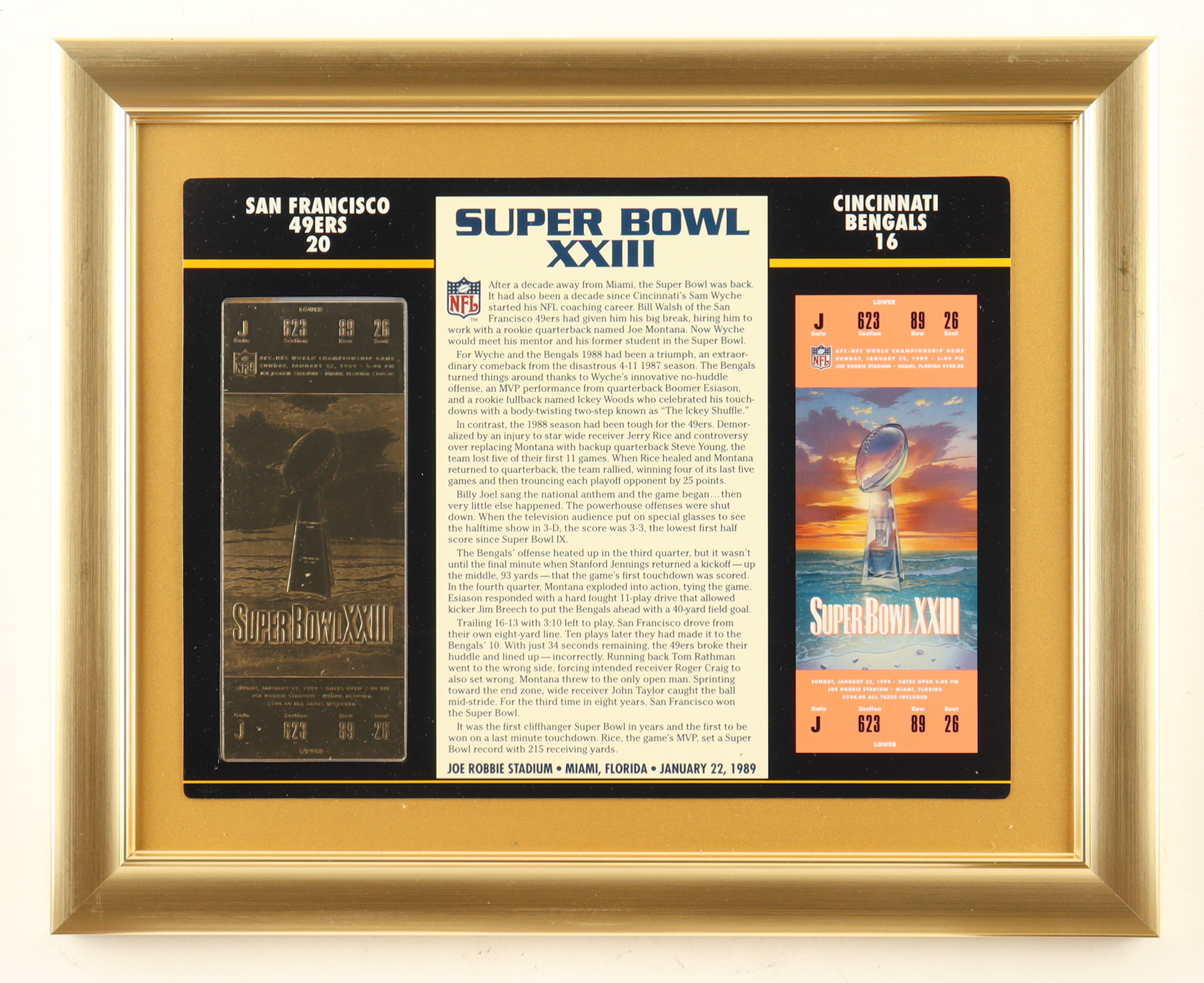 Super Bowl XXIII Commemorative Score Card with 23KT Gold Ticket Framed Display