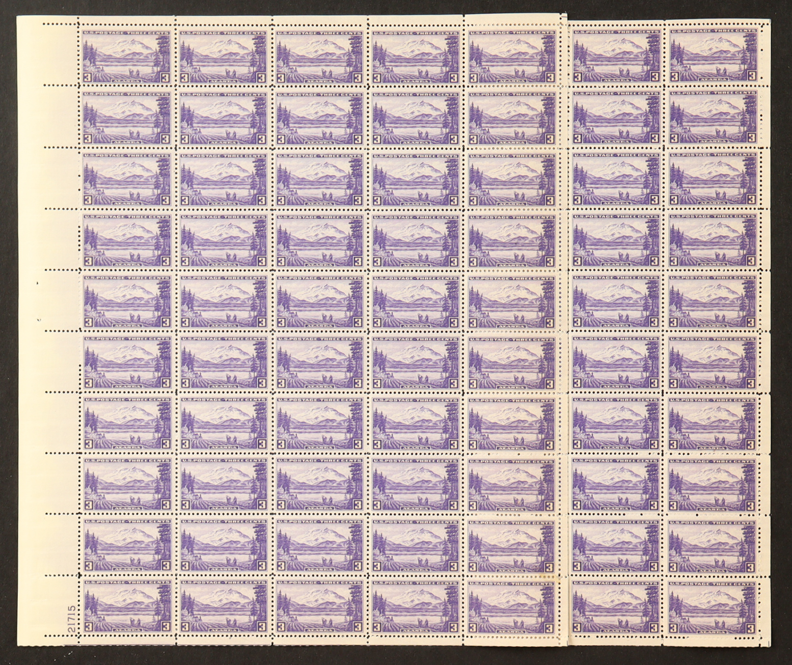 U.S. Postage 3¢ "Alaska Territory" Stamp - Issued November 12th 1937 - Full Original Uncut Sheet Of (50) Stamps