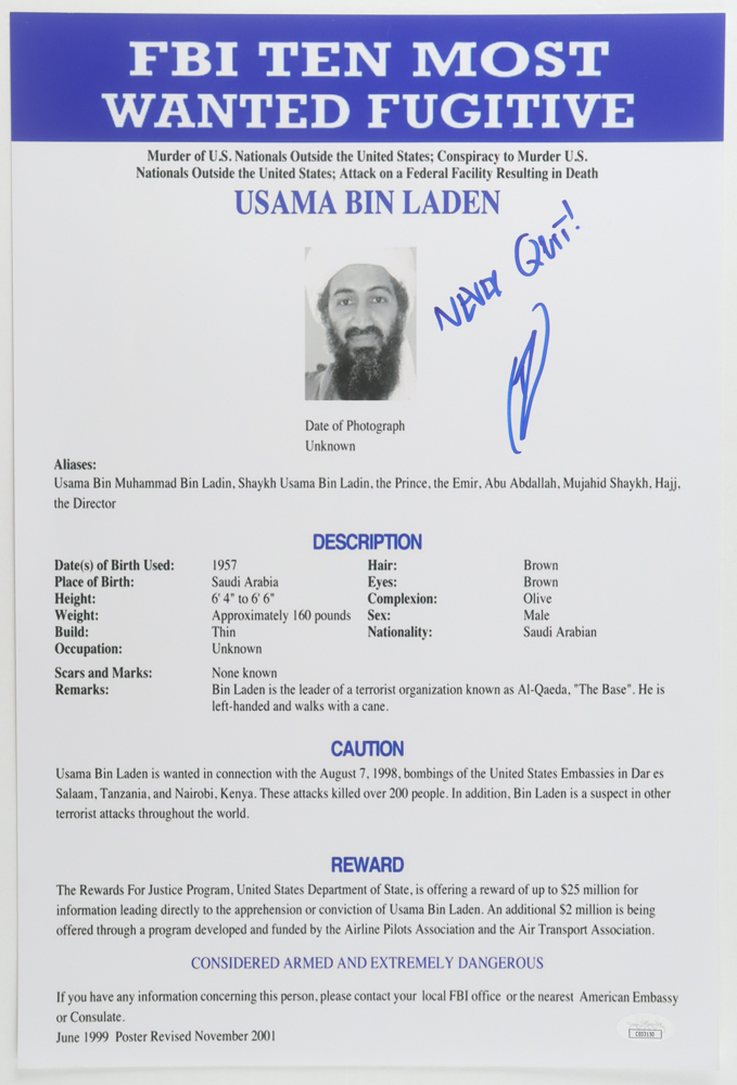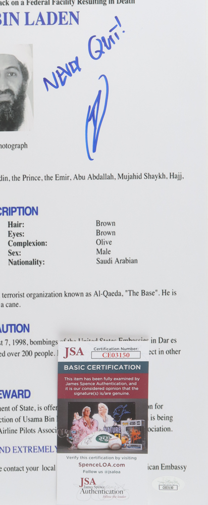 Robert J. O'Neill Signed 12x18 Wanted Poster Inscribed "Never Quit!" (JSA)