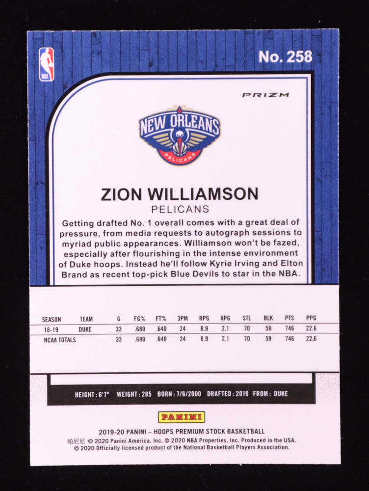 Zion Williamson 2019-20 Hoops Premium Stock Prizms Black Pulsar #258 RC