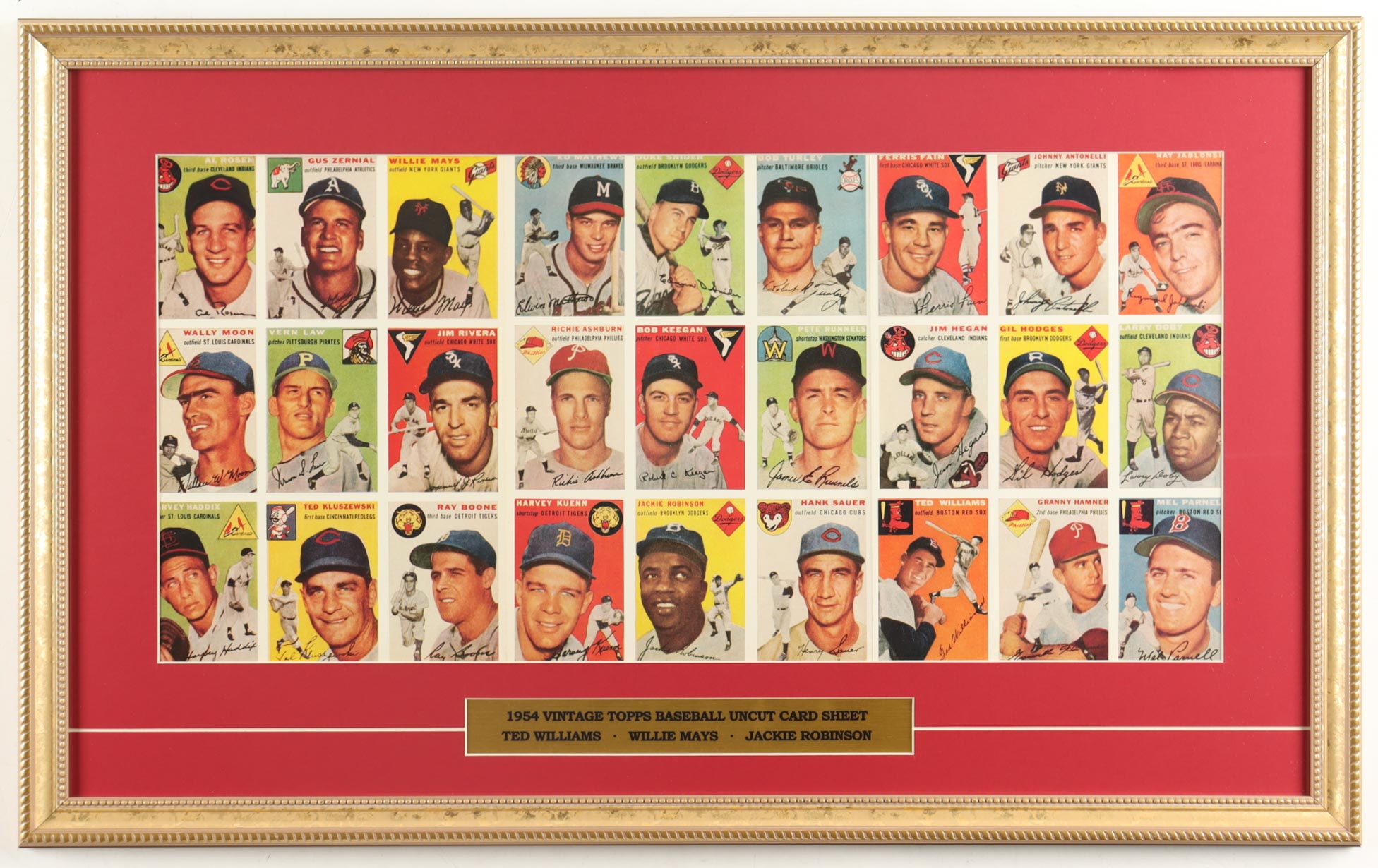 Custom framed display measures approximately 18" x 29" in size and features an uncut sheet of 1954 Topps baseball cards. The display also includes a title plaque. Please note that the item is unsigned.