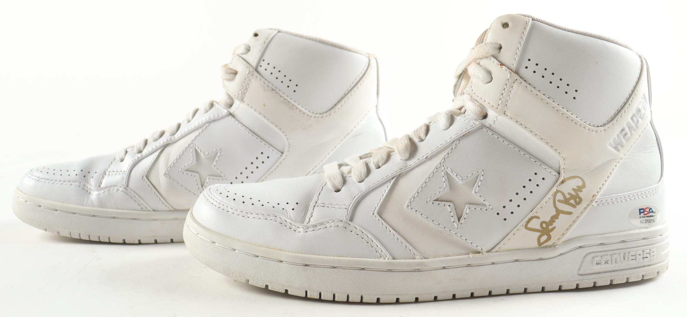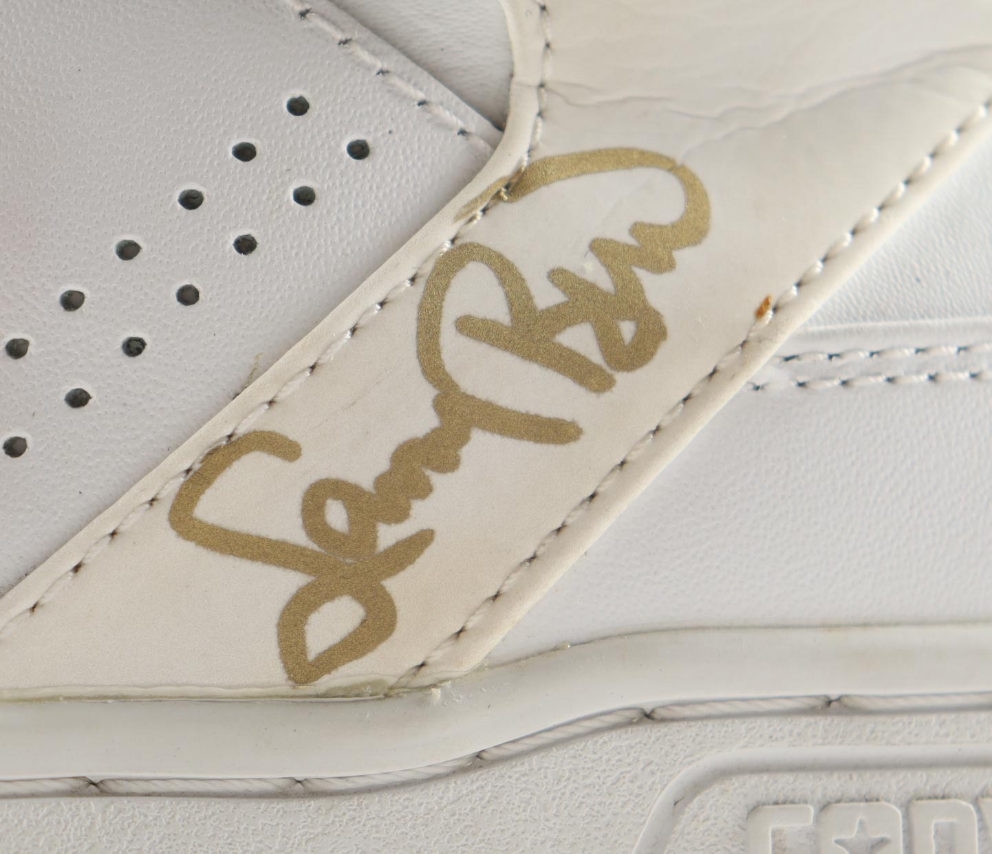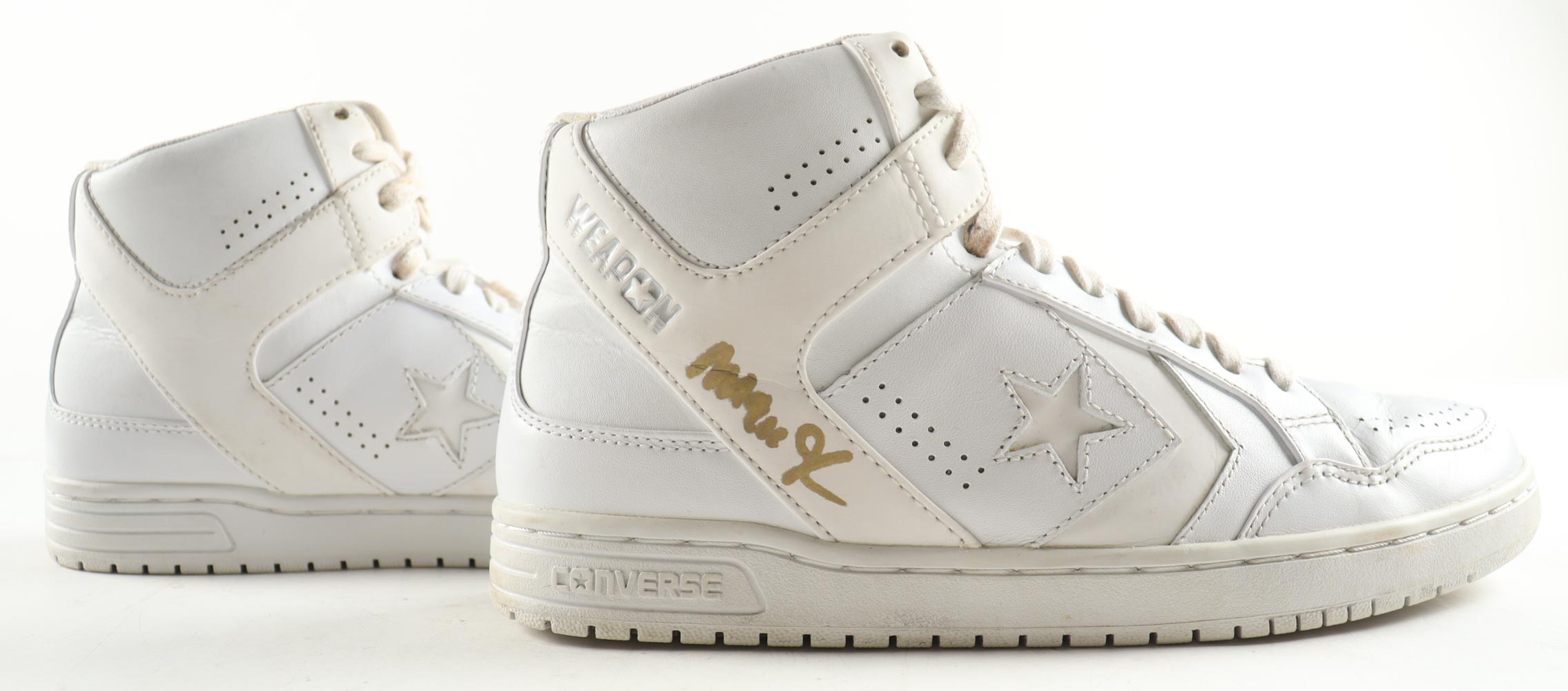 Pair of (2) Converse Weapon White Leather Basketball Shoes, size 12. Hand-signed by Magic Johnson (Los Angeles Lakers, HOF) and Larry Bird (Boston Celtics, HOF). Please see photos for more detail regarding the condition of the item(s).