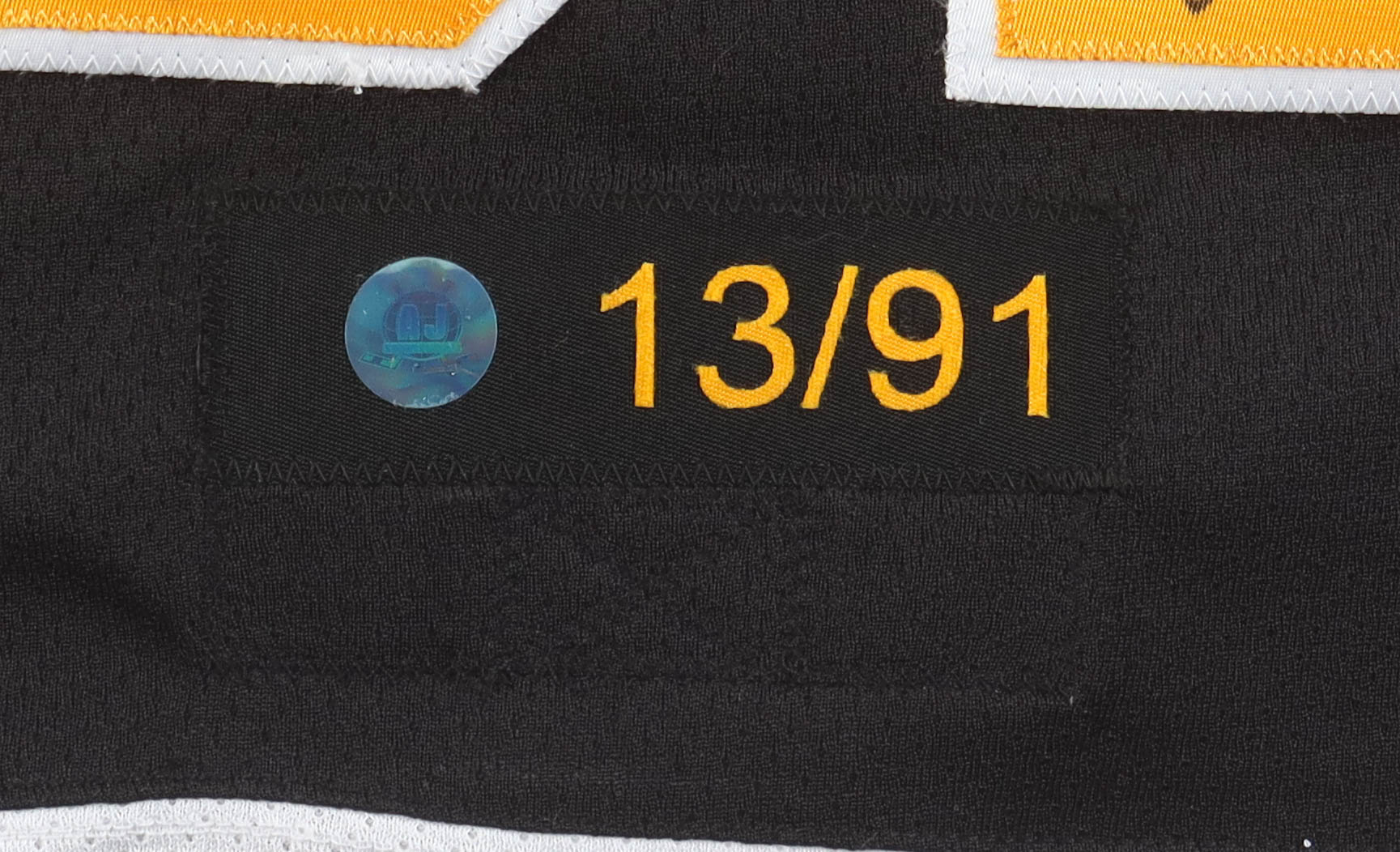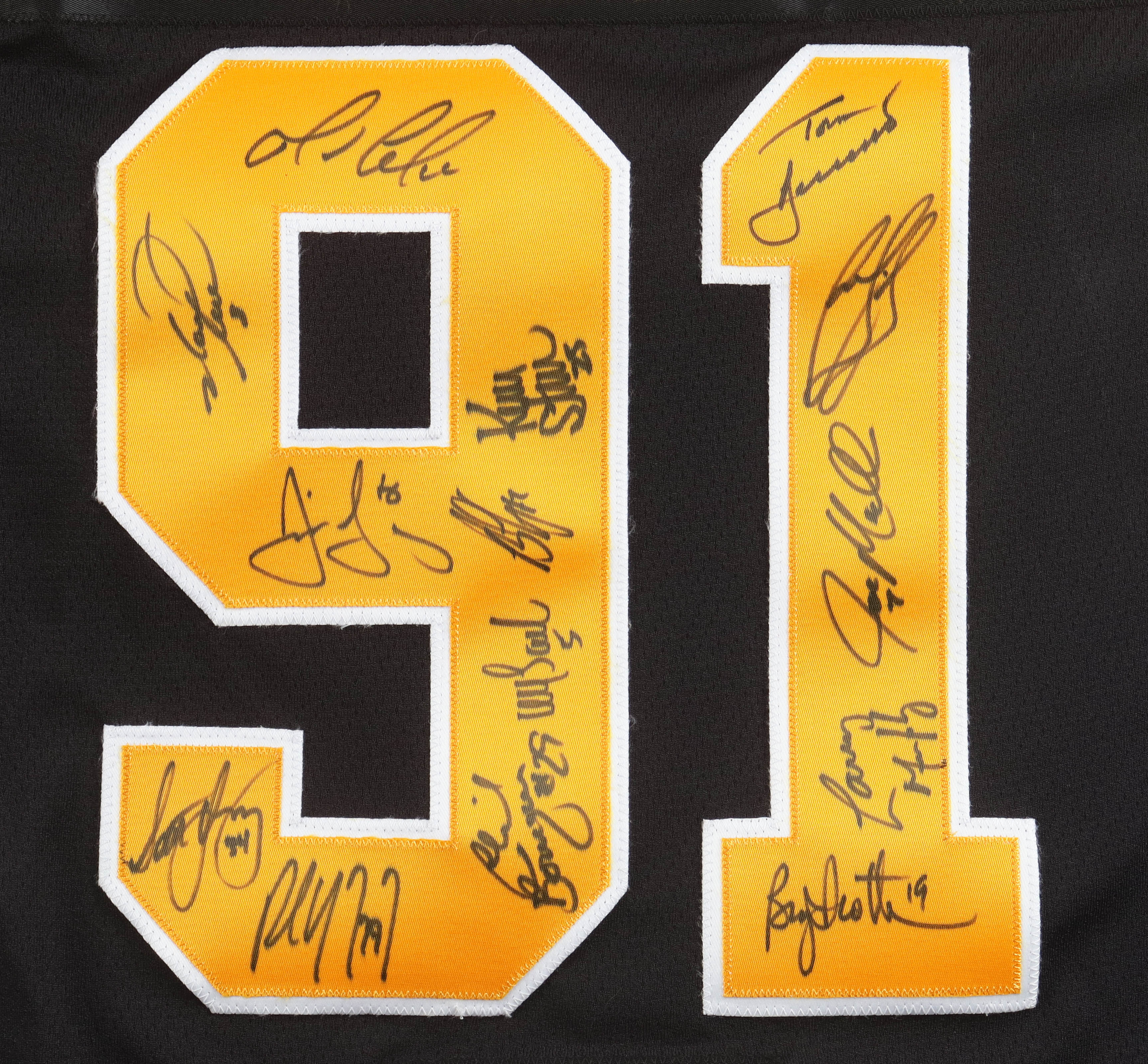 Adidas jersey with everything sewn on, size 52. Hand-signed by (14) with Mario Lemieux (HOF, Jaromir Jagr (HOF), Ron Francis (HOF), Tom Barrasso (HOF), Paul