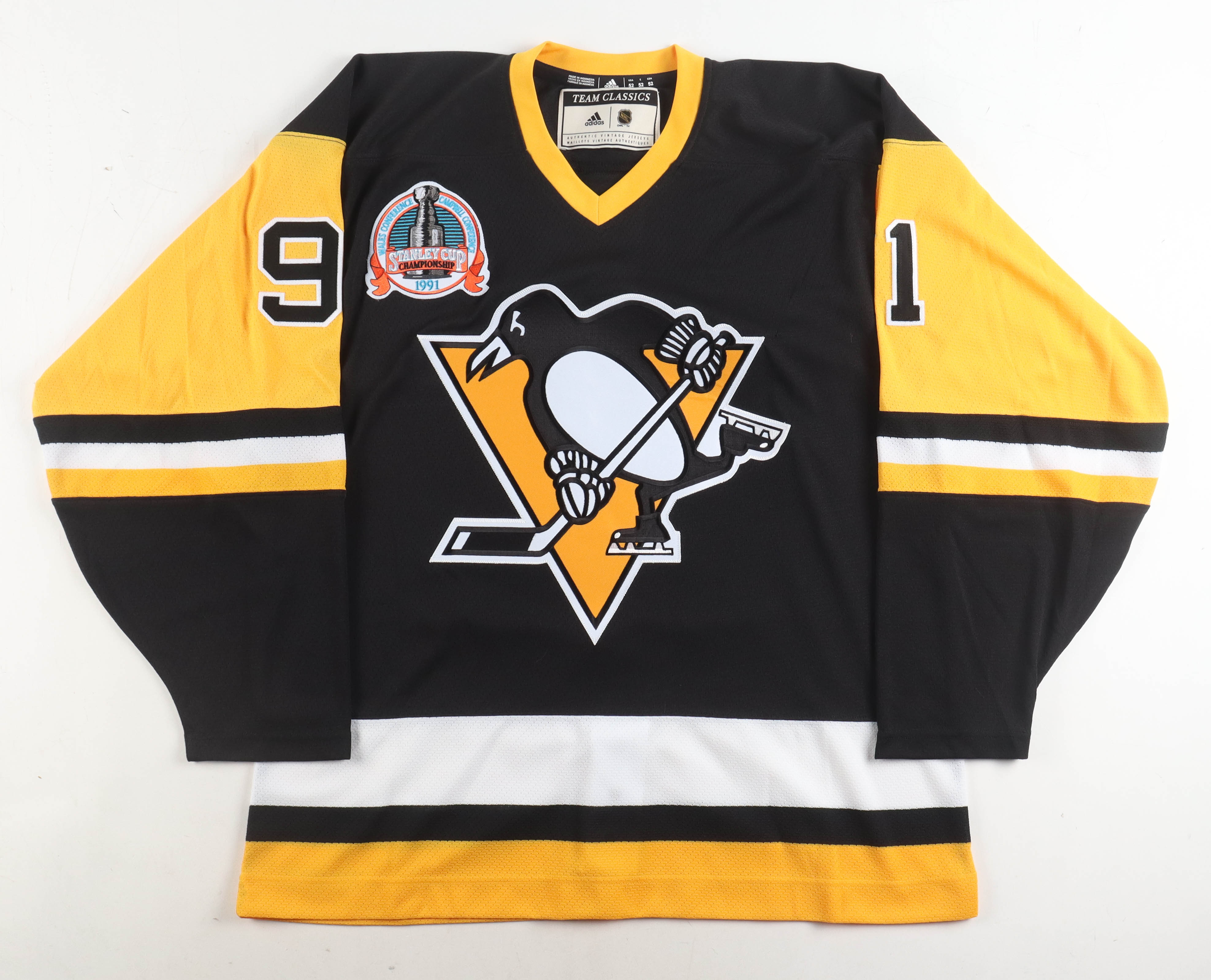 Coffey (HOF), Marc Recchi (HOF), Larry Murphy (HOF), Joe Mullen (HOF), Bryan Trottier, Kevin Stevens, Ulf Samuelsson, Phil Bourque, Bob Errey and Scott Young (Pittsburgh Penguins). Includes 1991 Stanley Cup Championship patch.