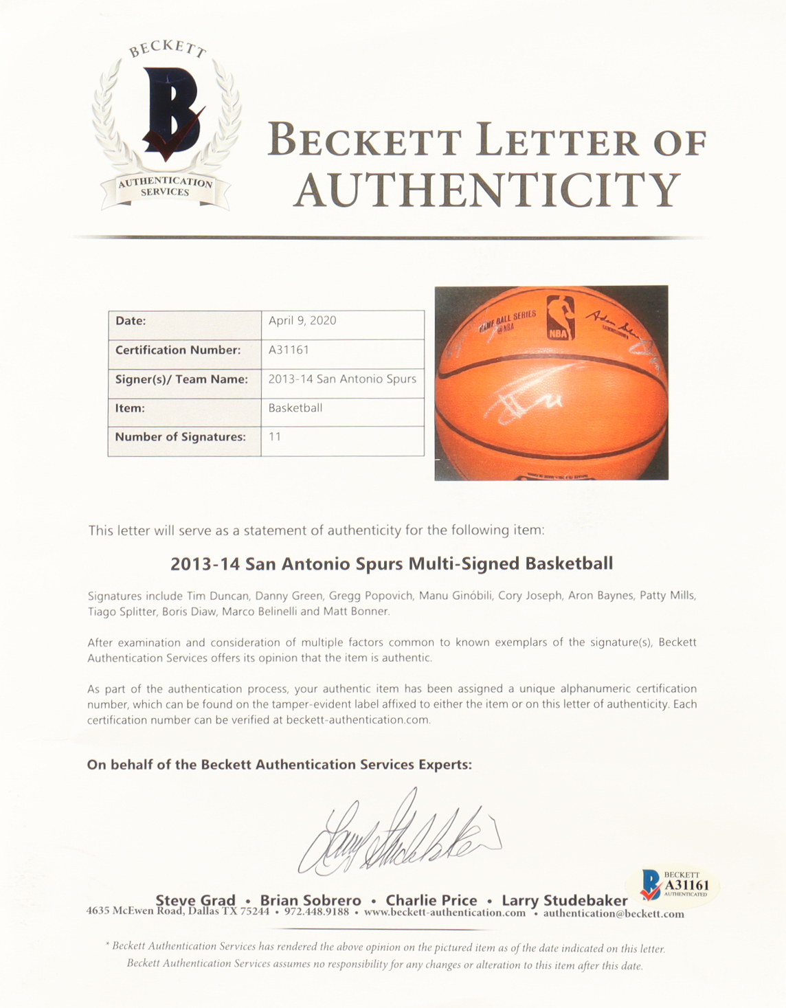 Spalding 2013 San Antonio Spurs NBA Official Game Ball Series NBA basketball. Team-signed by (11) with Tim Duncan, Danny Green, Gregg Popovich, Manu Ginobili, Cory Joseph, Aron Baynes, Patty Mills, Tiago Splitter, Boris Diaw, Marco Belinelli and Matt Bonner. Display case is included as shown. Please see photos for more details.