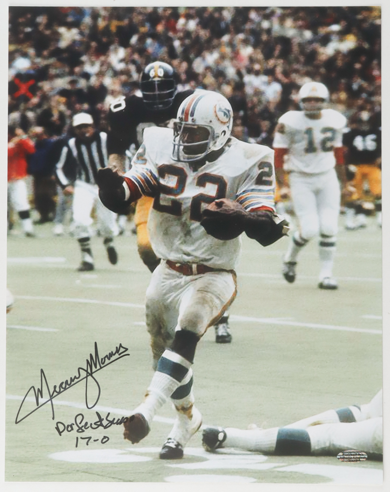 Photo measures 11" x 14" in size and has been hand-signed and inscribed by Mercury Morris (Miami Dolphins).