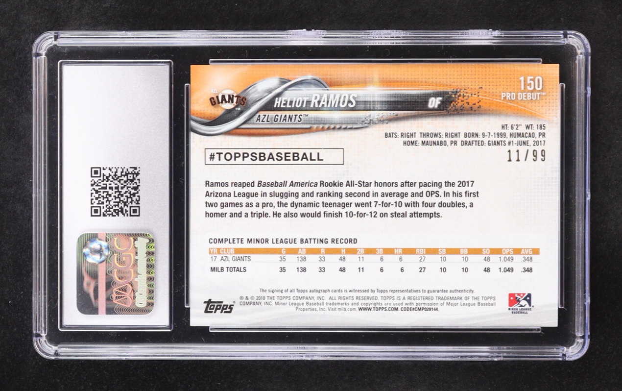 Heliot Ramos 2018 Topps Pro Debut Autographs Green #150 RC #11/99 (CGC 9 | Autograph Graded CGC 10)