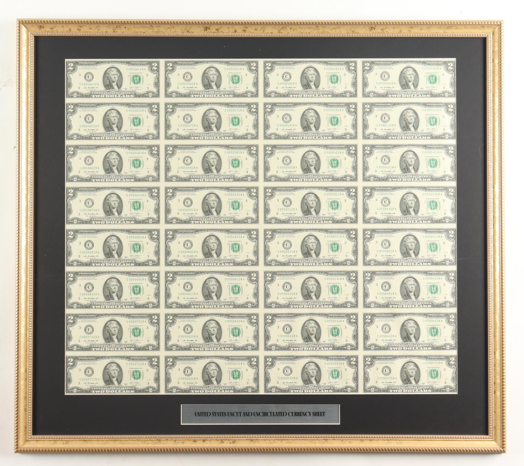 Custom frame measures approximately 27" x 30" in size and features an uncut sheet of (32) 2013 U.S. $2 dollar bills. Please note, the display is unsigned.