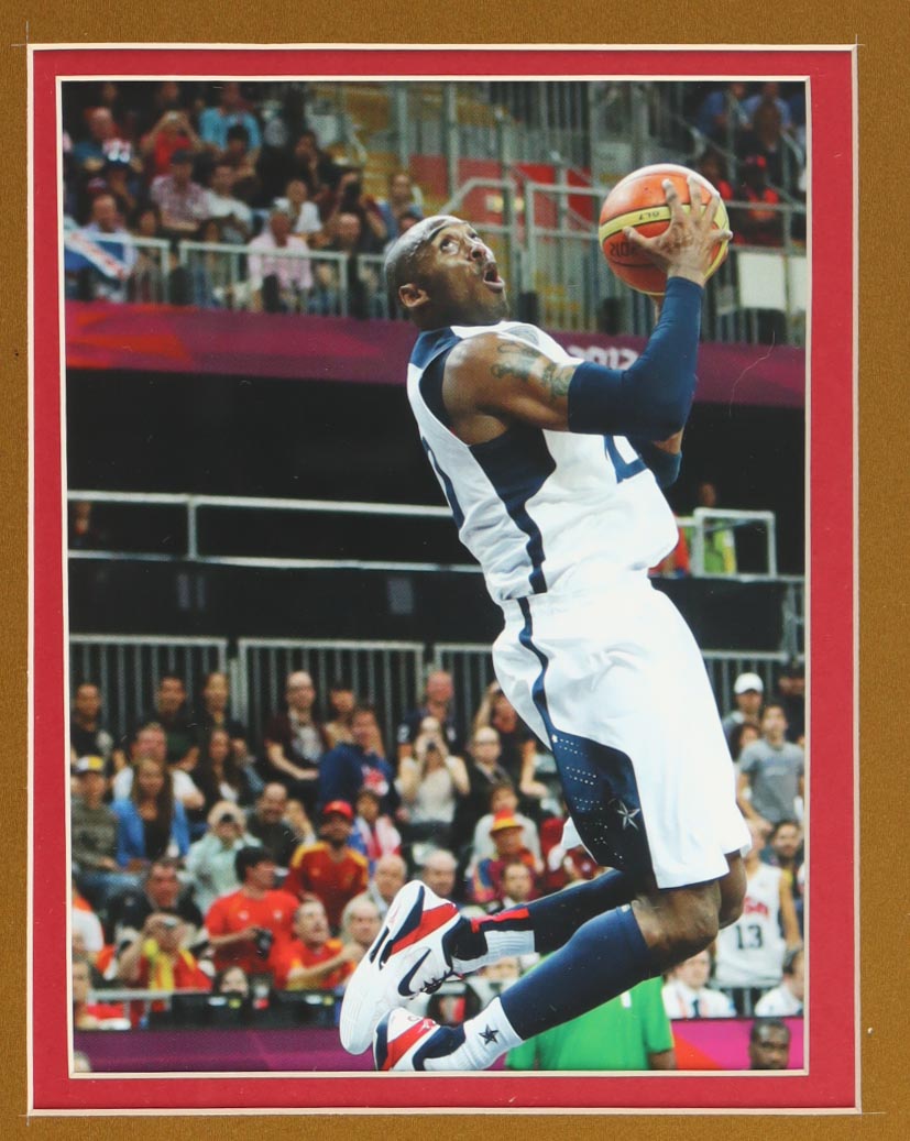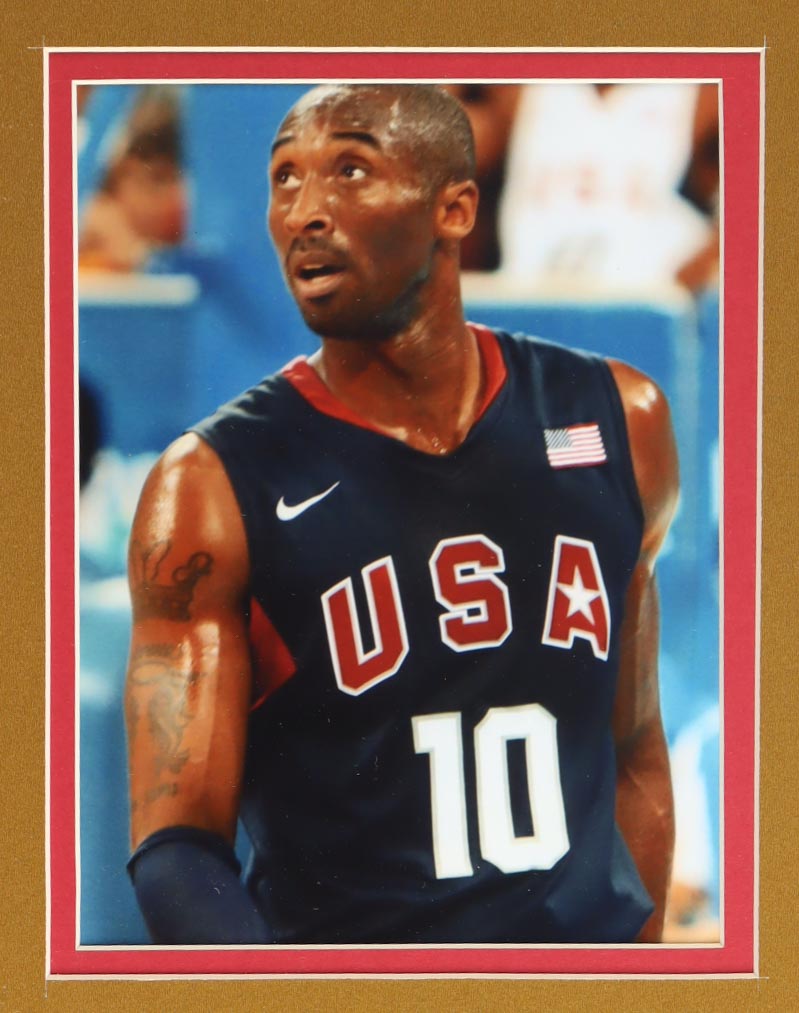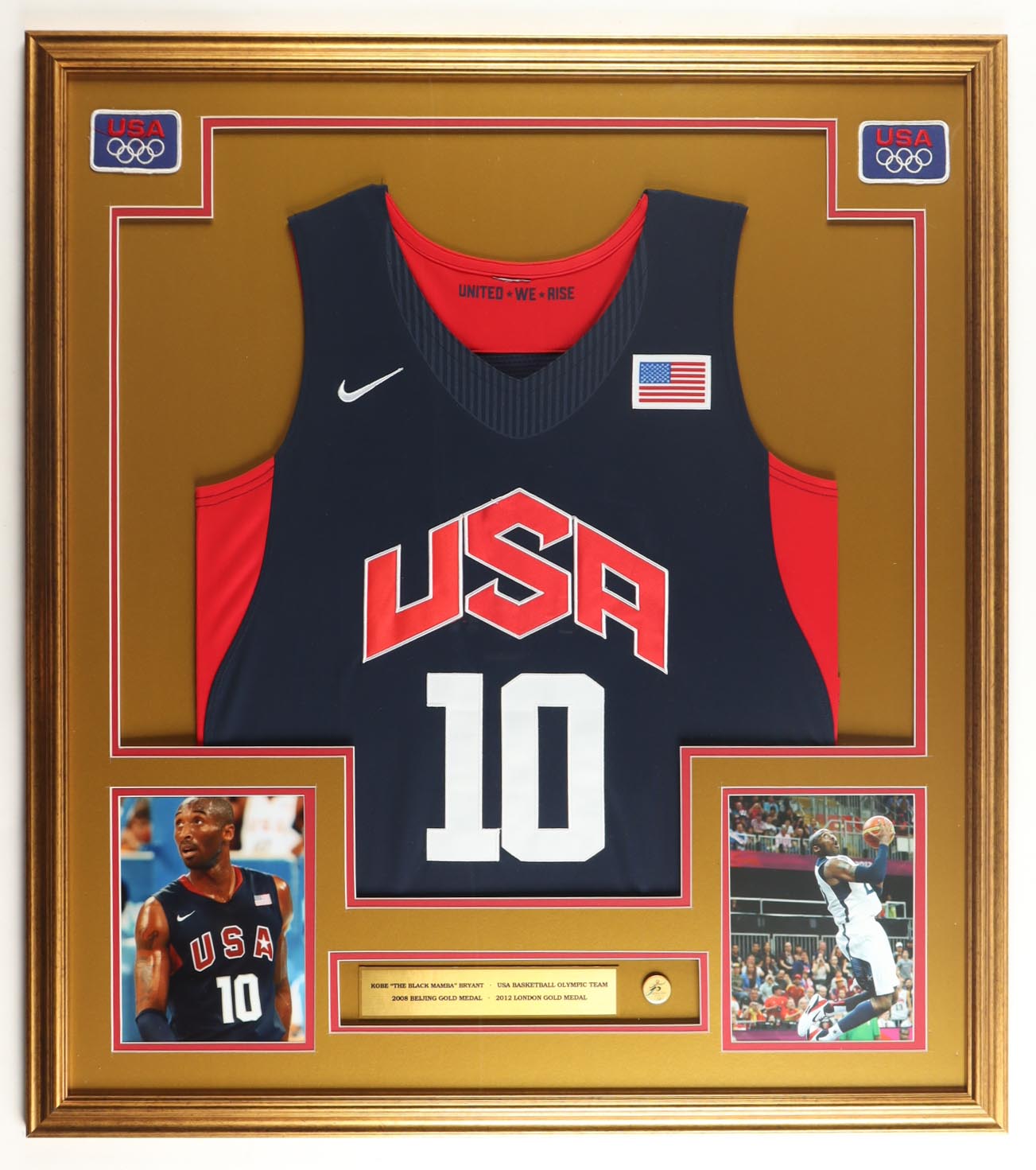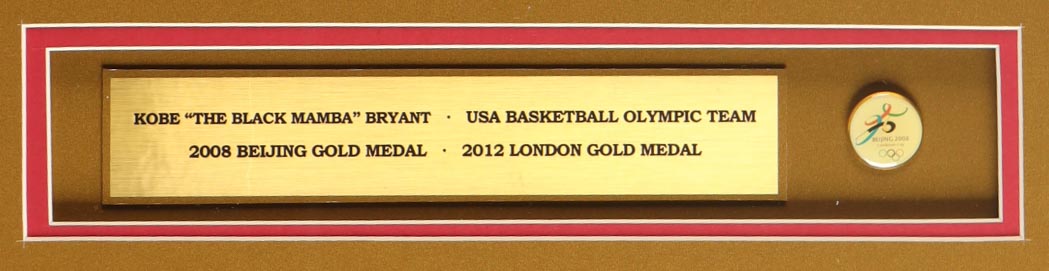 Custom frame measures approximately 32" x 36" in size and features an unsigned Kobe Bryant (D. 2020, HOF) Jersey. The display also includes (2) 8" x 10" Photos, (2) Team Logo Patches and Olympic pin. Please note, the display is unsigned.