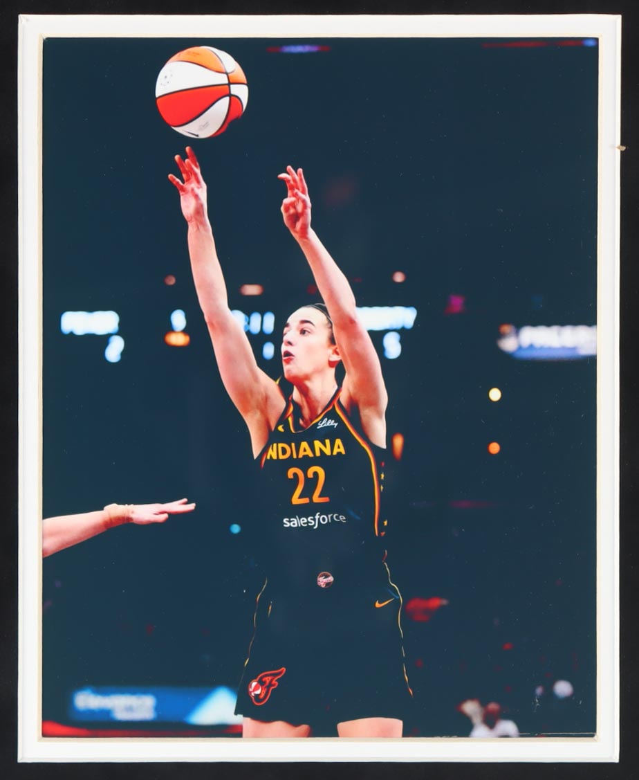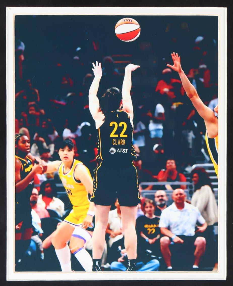 Custom frame measures approximately 32.5" x 39.5" in size and features a jersey that has been hand-signed by Caitlin Clark (Iowa Hawkeyes). Display also includes (2) 8" x 10" photos.