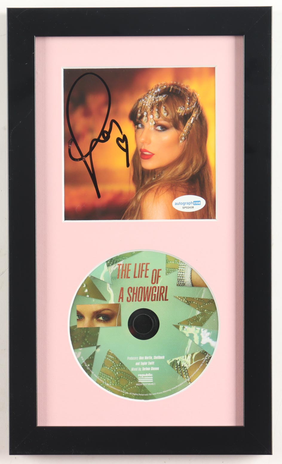 Custom frame measures approximately 8" x 13.5" in size and features a "The Life of a Showgirl" CD insert that has been hand-signed by Taylor Swift. Disc included.
