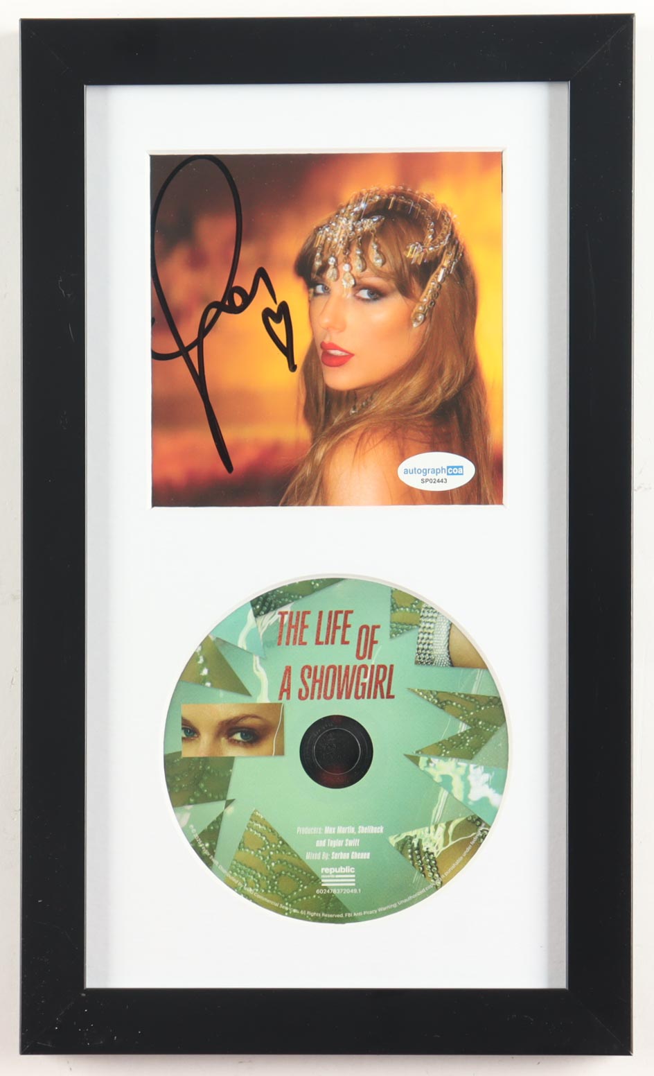 Custom frame measures approximately 8" x 13.5" in size and features a "The Life of a Showgirl" CD insert that has been hand-signed by Taylor Swift. Disc included.