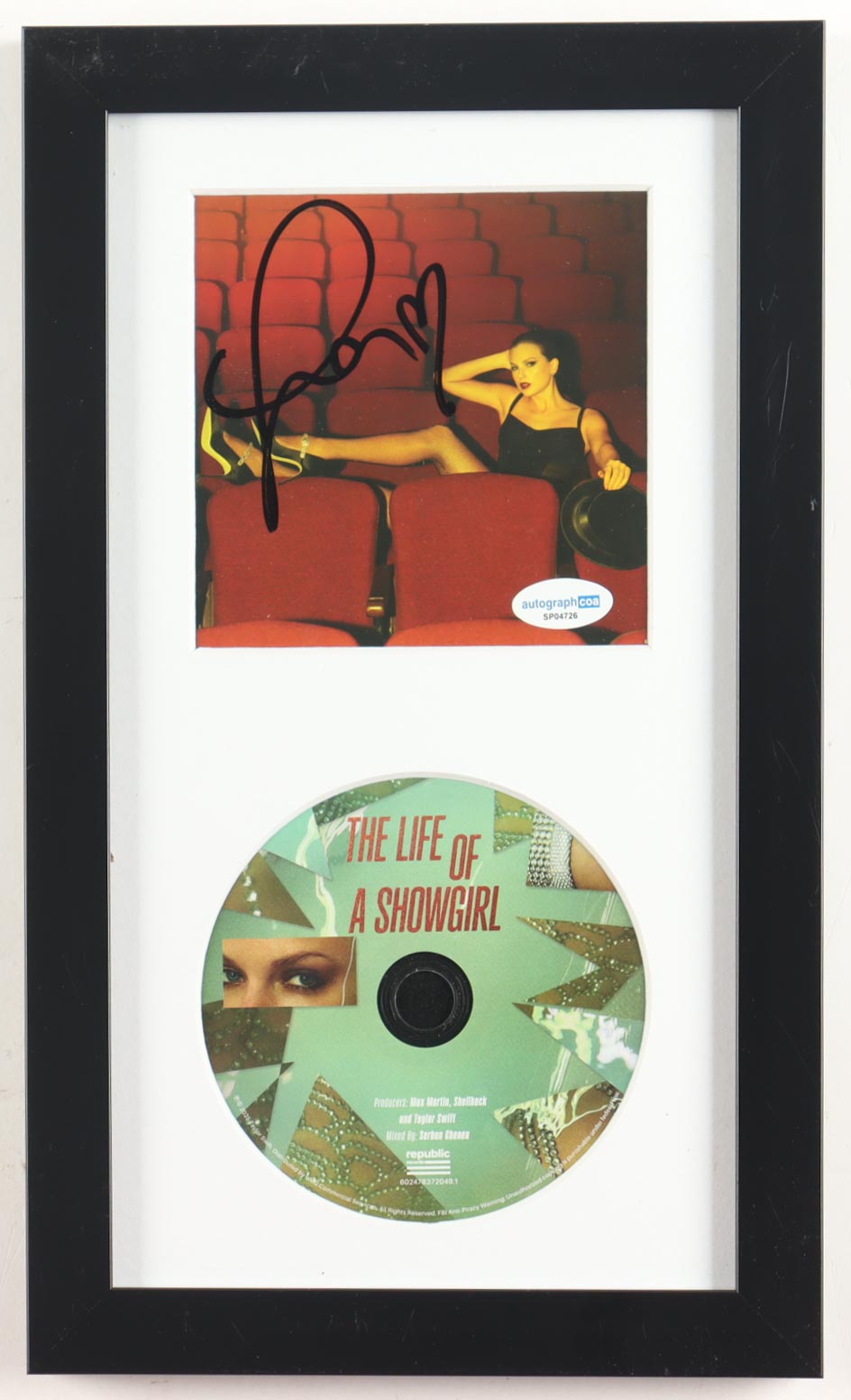 Custom frame measures approximately 8" x 13.5" in size and features a "The Life of a Showgirl" CD insert that has been hand-signed by Taylor Swift. Disc included.