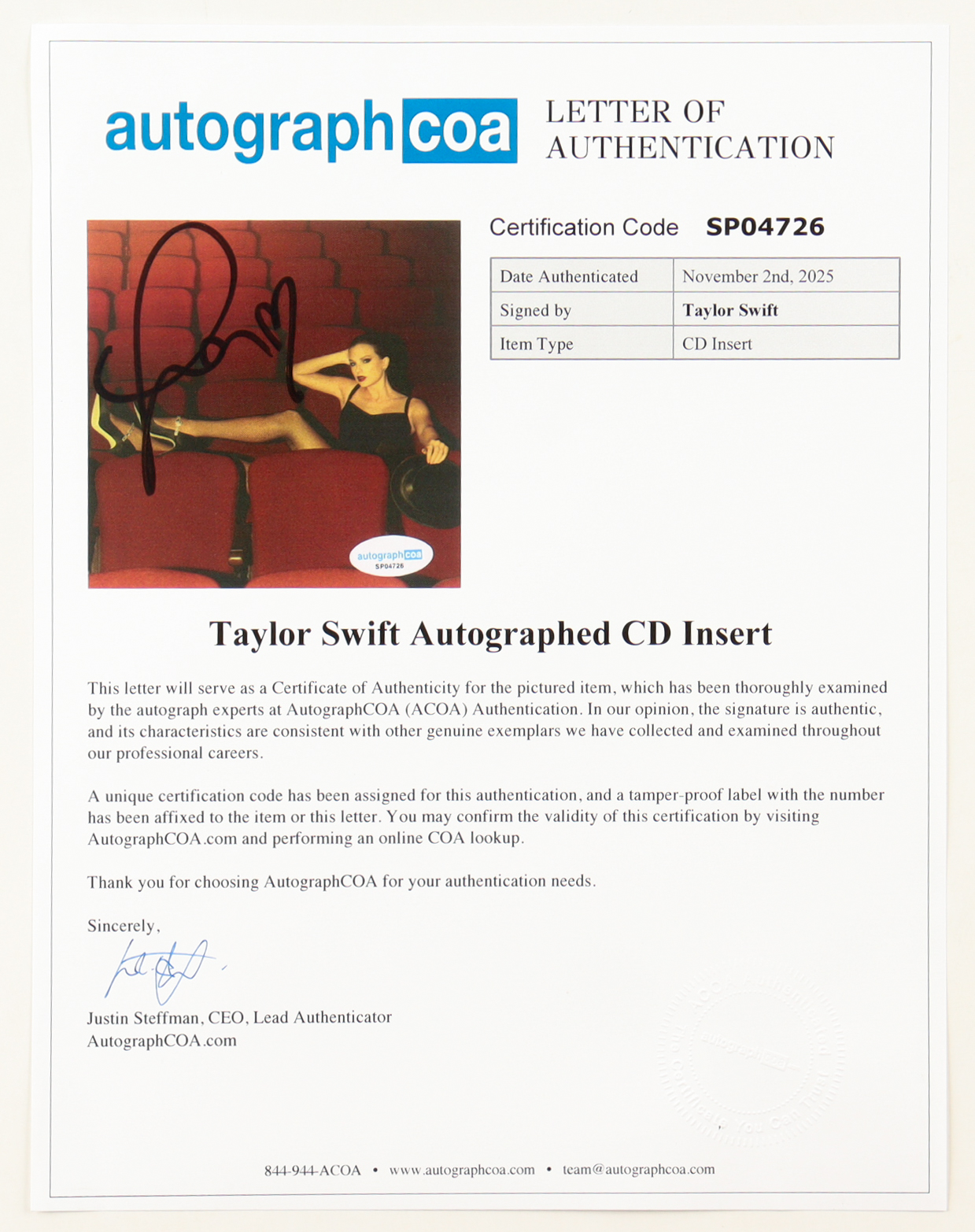 The lot / autograph(s) includes an official AutographCOA (ACOA) Authentication hologram and matching LOA for authenticity purposes.