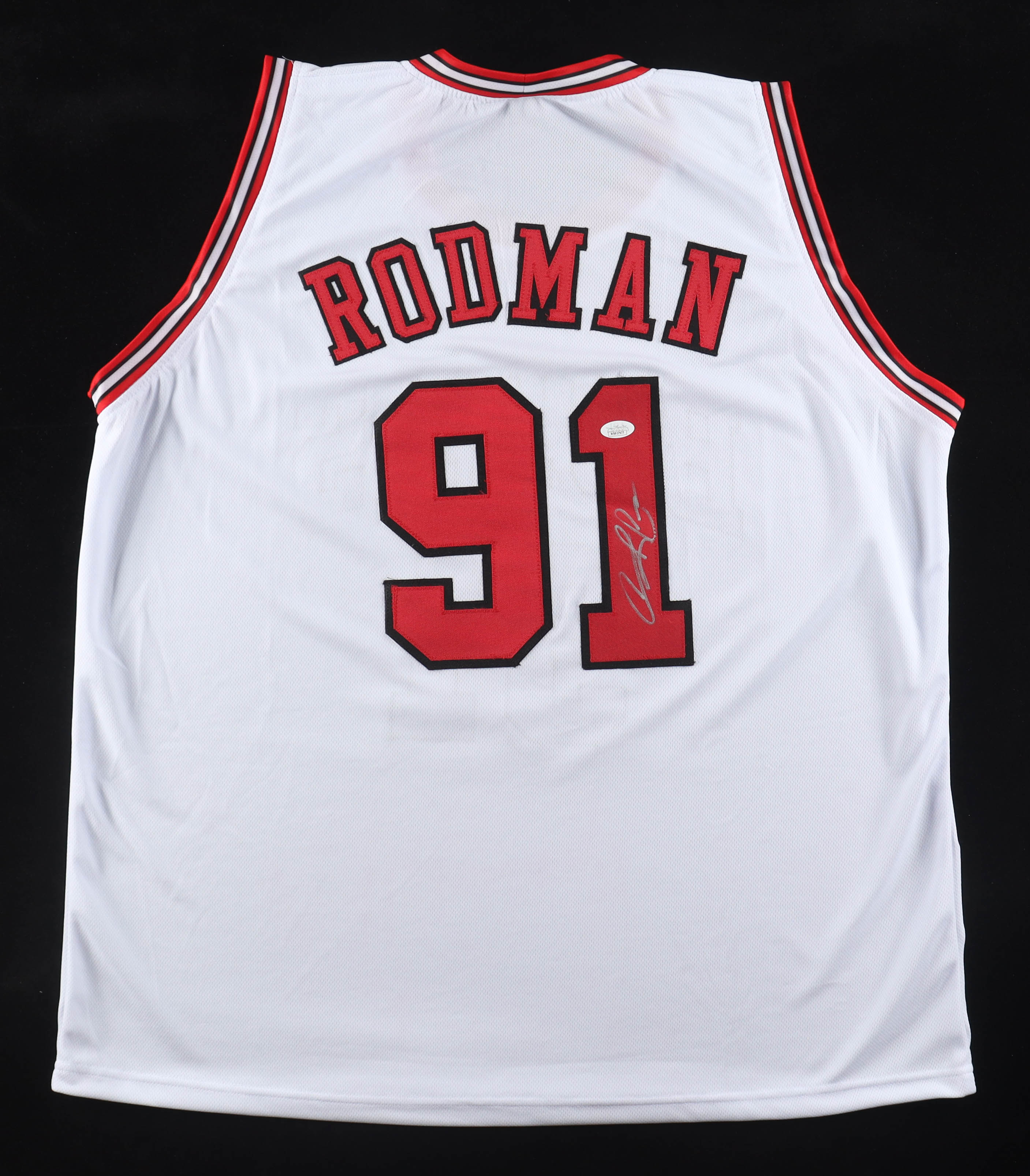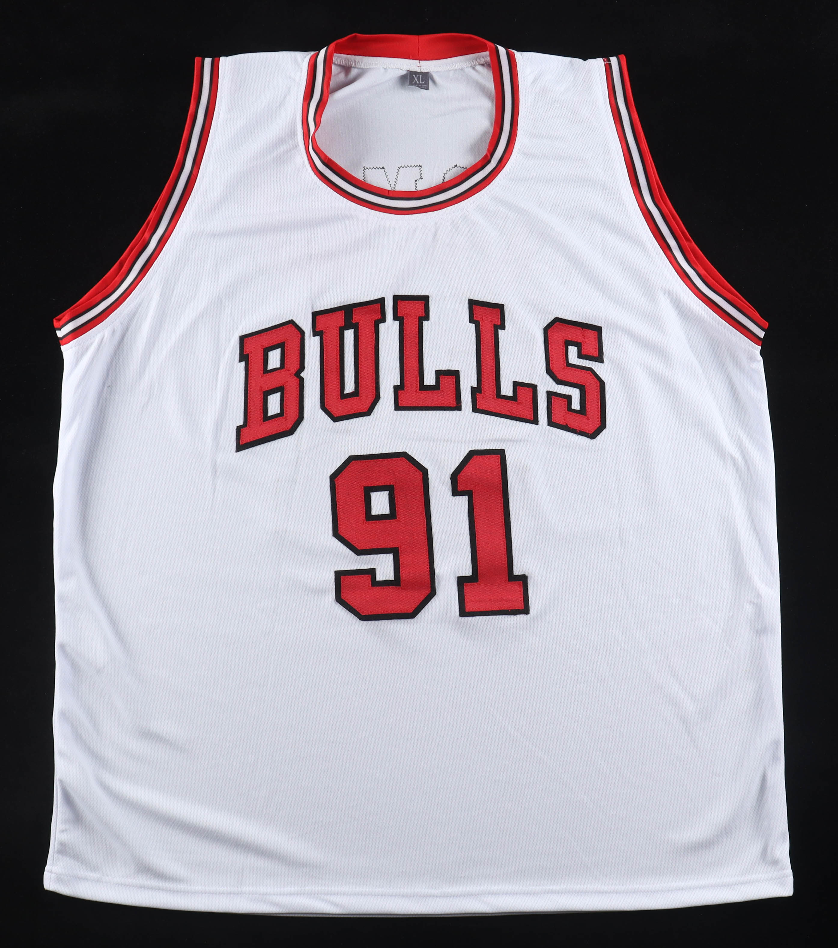 Custom jersey with everything sewn on, size XL. Has been hand-signed by Dennis Rodman (Chicago Bulls, HOF).