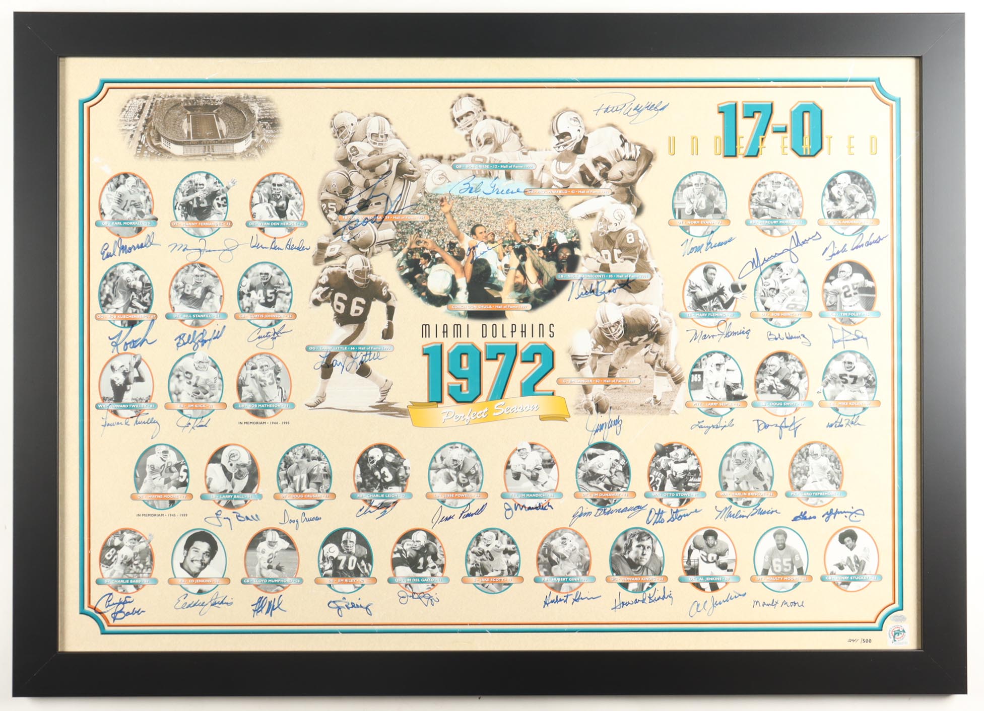 Custom frame measures approximately 30.5" x 42.5" in size and features a limited edition #241/500 poster that has been team-signed by (46) members of the legendary 1972 Miami Dolphins football team! This team was the first team to have a perfect season and going 17-0 and capping off the year with a Super Bowl victory! The 1972 team is still the only team today that has ever recorded a perfect season in the NFL!