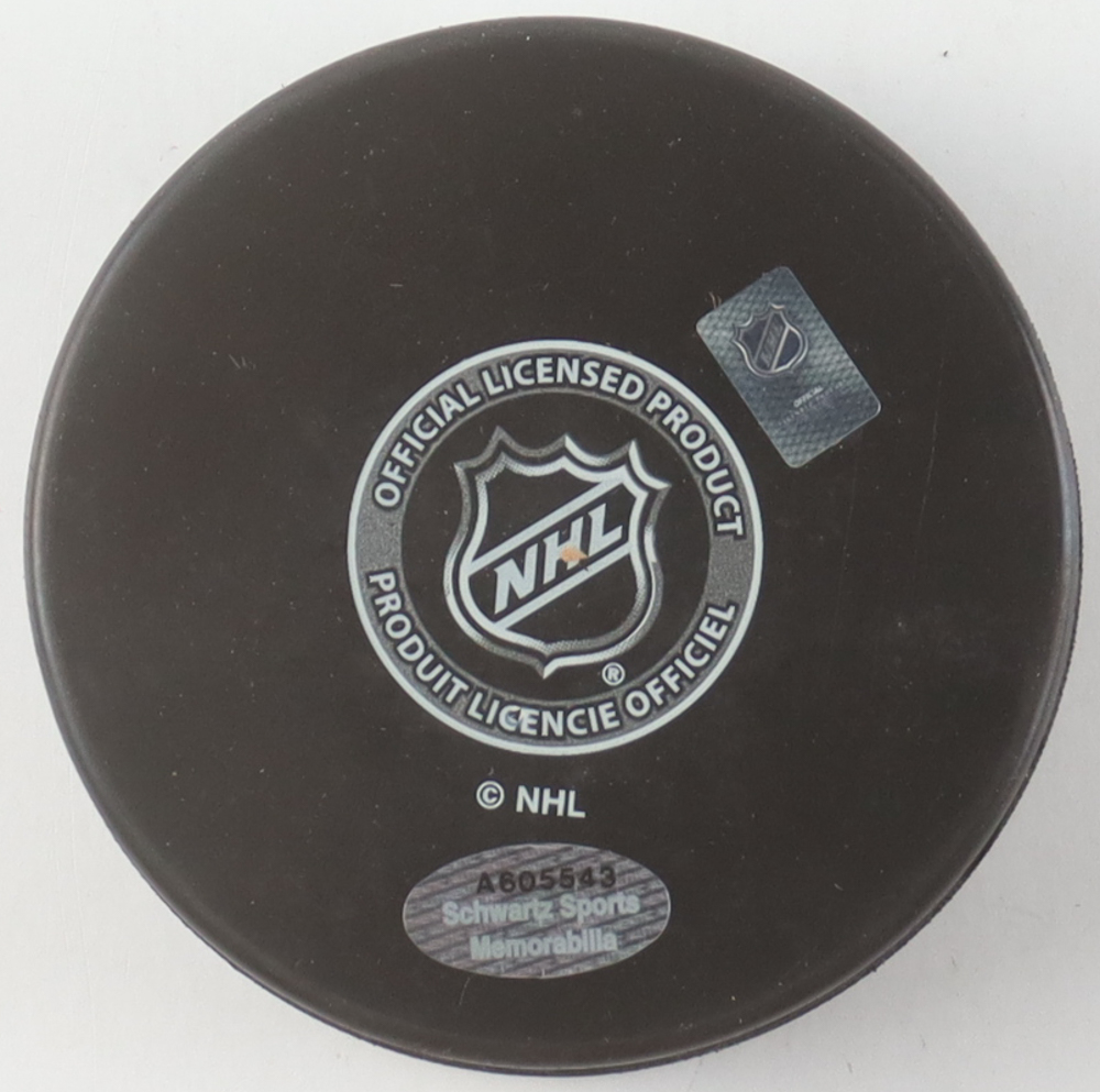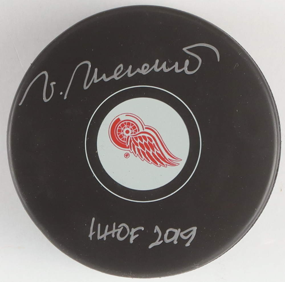 Detroit Red Wings logo hockey puck. Hand-signed and inscribed by Vaclav Nedomansky (HOF).