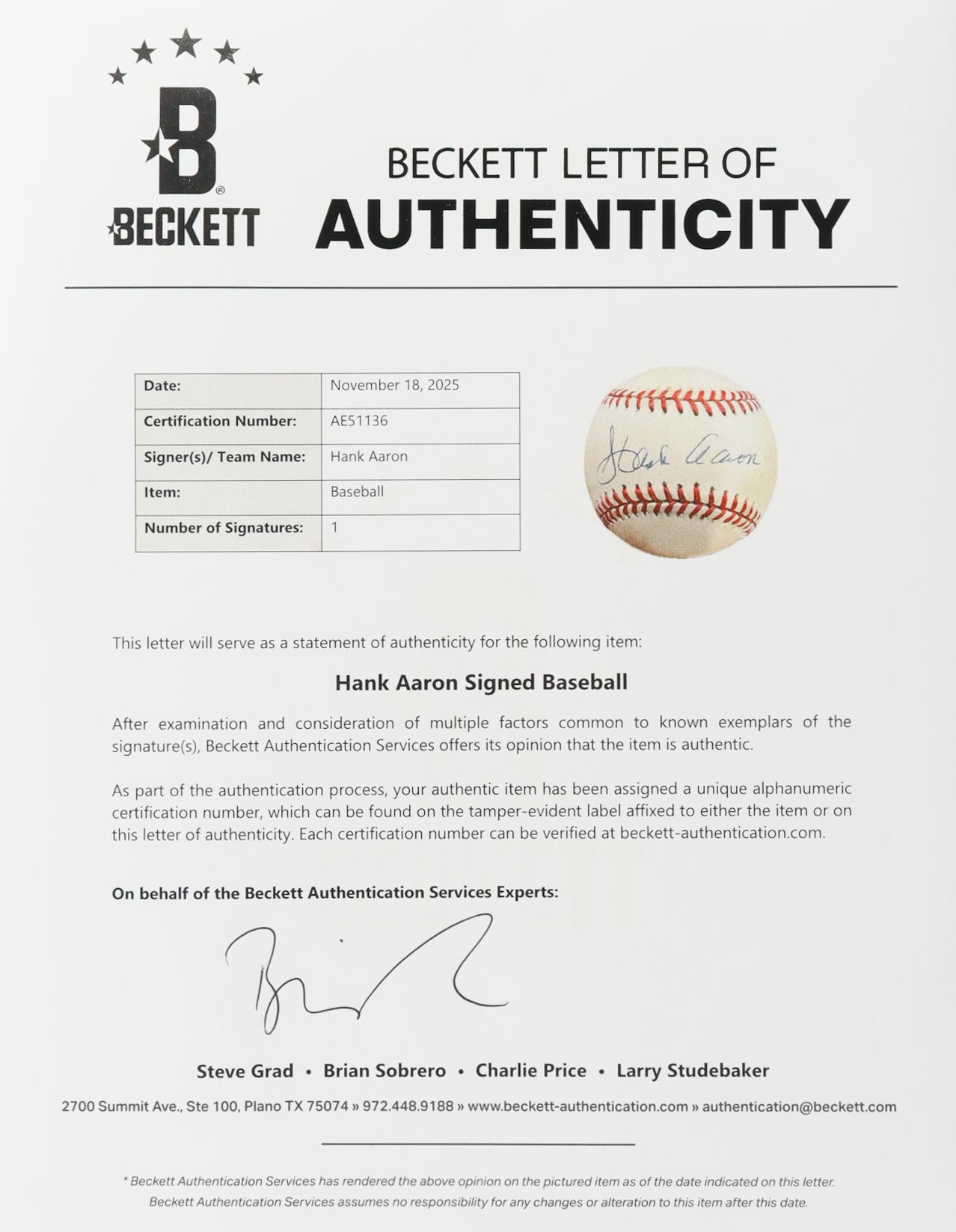 Rawlings Official National League baseball. Hand-signed by Hank Aaron (D. 2021, Atlanta Braves, HOF). The display case is included as shown. Please note, the ball is naturally toned and has staining.
