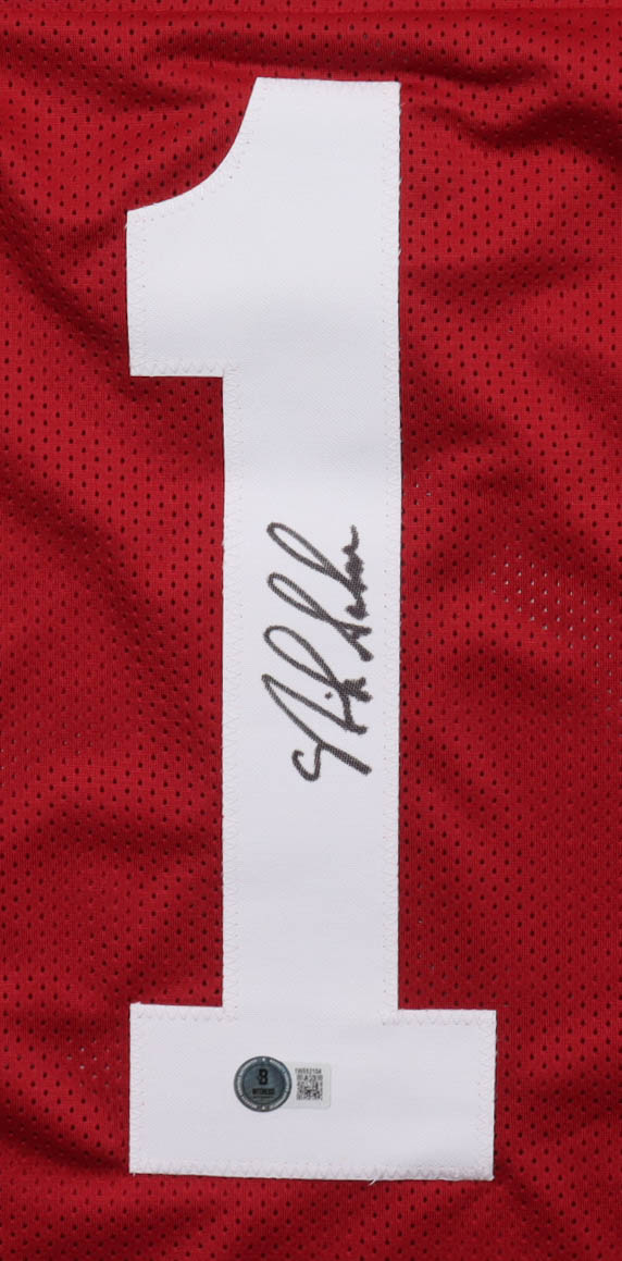 Custom jersey with everything sewn on, size XL. Hand-signed by Nick Saban.