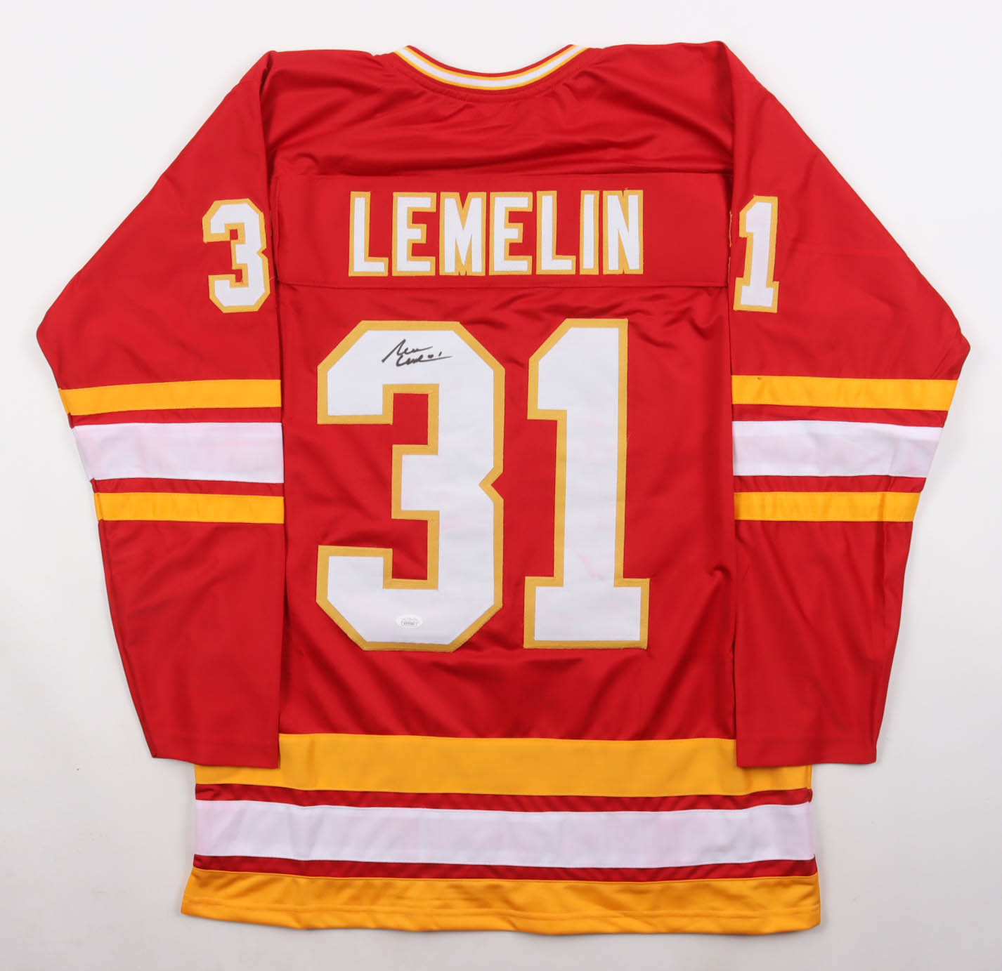 Custom jersey with everything sewn on, size XL. Hand-signed by Rejean Lemelin. Please note, there is red staining throughout the jersey. See photos regarding the condition of the item.