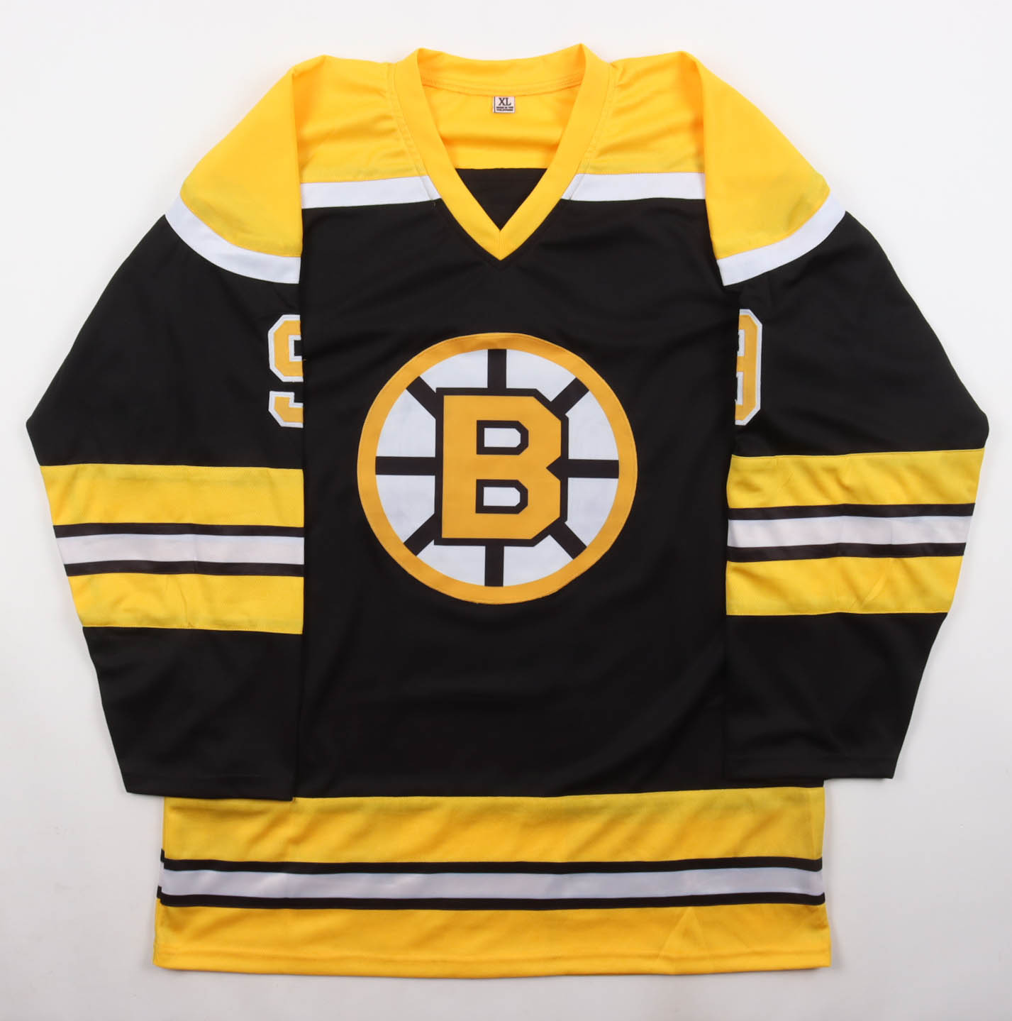 Custom jersey with everything sewn on, size XL. Hand-signed and inscribed by Johnny Bucyk (HOF).