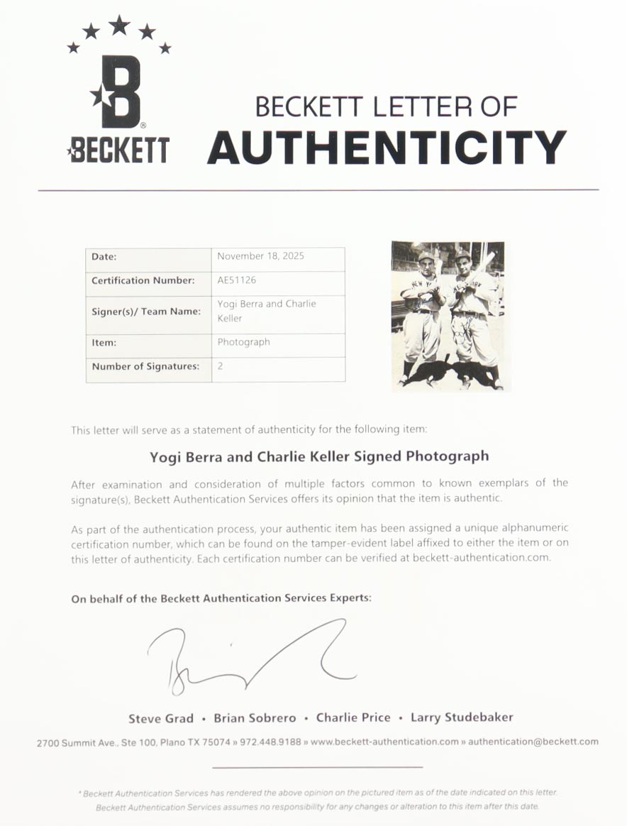 Photo measures approximately 8" x 10" in size and has been hand-signed by Yogi Berra (D. 2015, New York Yankees, HOF) and Charlie Keller (D. 1990, New York Yankees). Please note, there is some wrinkling and corner wear on the photo.